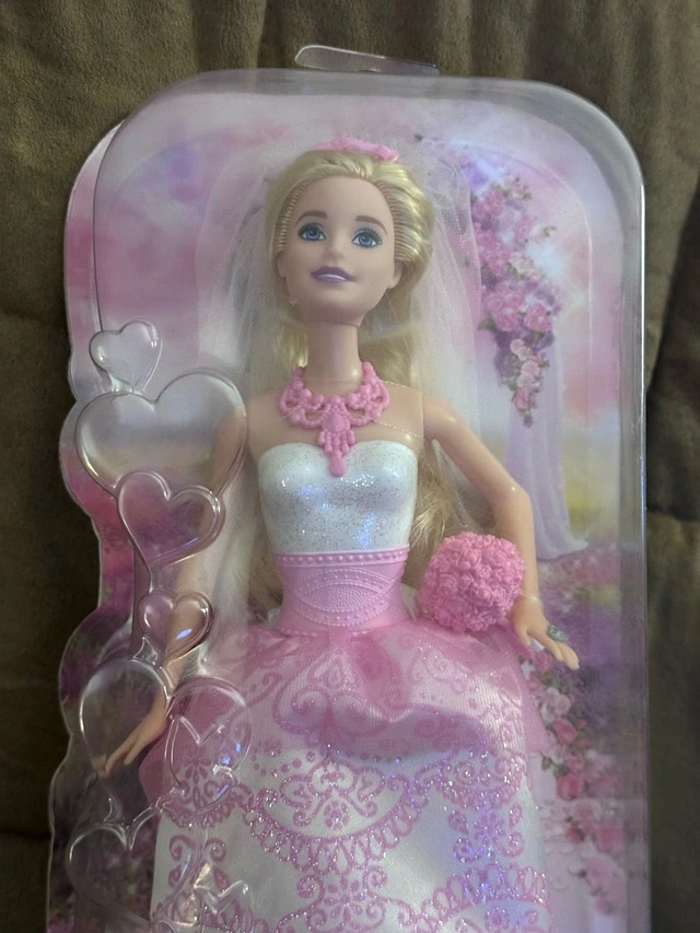 This is a new in-box Barbie Bride doll, perfect for collectors or children who love imaginative play. The doll features a beautiful bridal gown with intricate details and comes in its original packaging, ensuring its pristine condition. This Barbie would make a wonderful gift or a charming addition to any Barbie collection. * Brand: Barbie * Condition: New in box * Features: Bridal gown, original packaging Given that this Barbie is new and in its original packaging, a fair price would be slightly discounted from the MSRP. Dolls in similar condition are listed around $30-$40 on other platforms. If this ad is still up, then yes, it's still available!