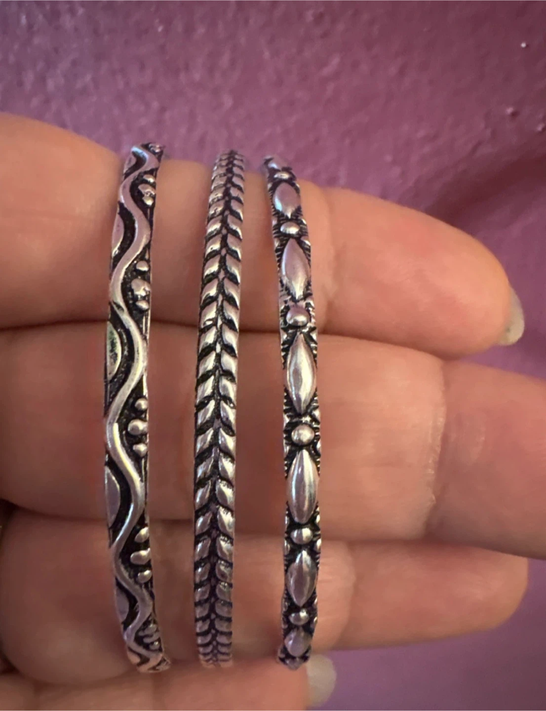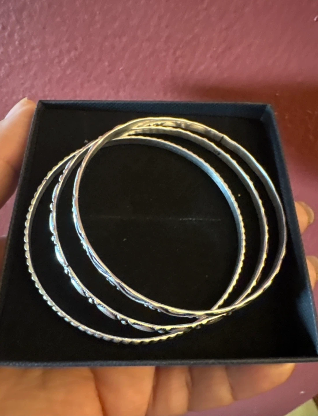 Selling a set of three unique 925 Silver bangles! They come in a box, ready for you to wear or gift. The bangles have different patterns, adding a unique touch to your jewelry collection comes with box and cleaning cloth New