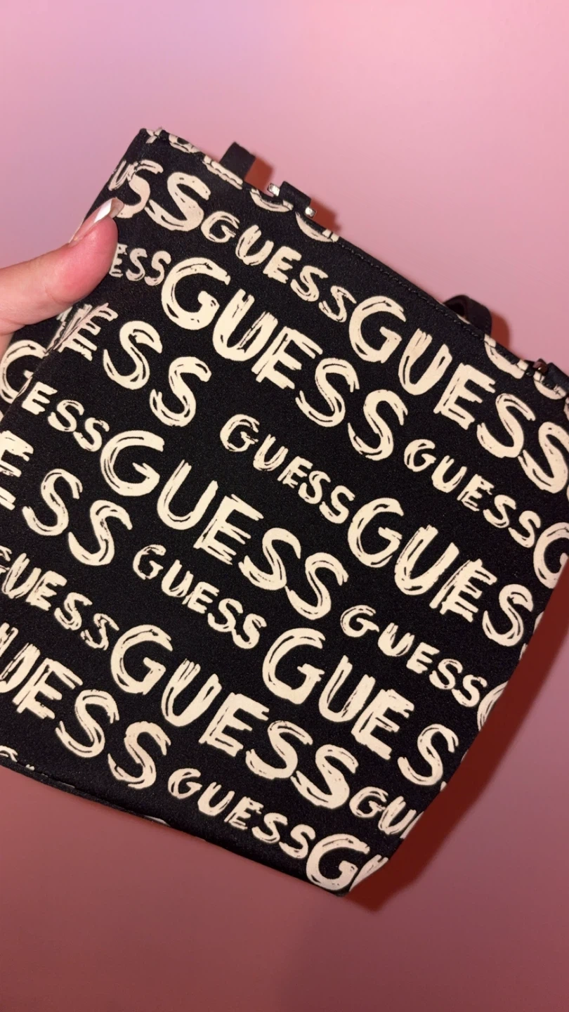 Super cute Guess mini tote bag in black and white! It's perfect for carrying your essentials. It has a magnetic closure and interior zipper pocket