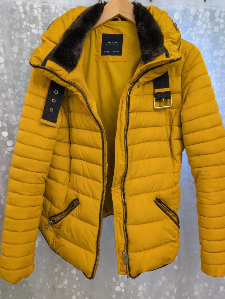Zara Basic Outerwear puffer jacket in size L. It’s a stylish mustard yellow colour with a faux fur collar and zipped hoodie.