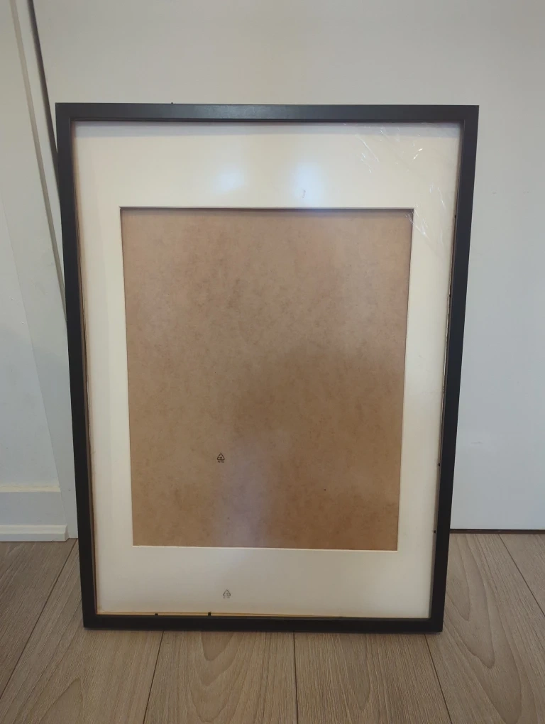 Selling a picture frame with a black frame and white matte. It's in great condition and ready for your favourite photo or artwork