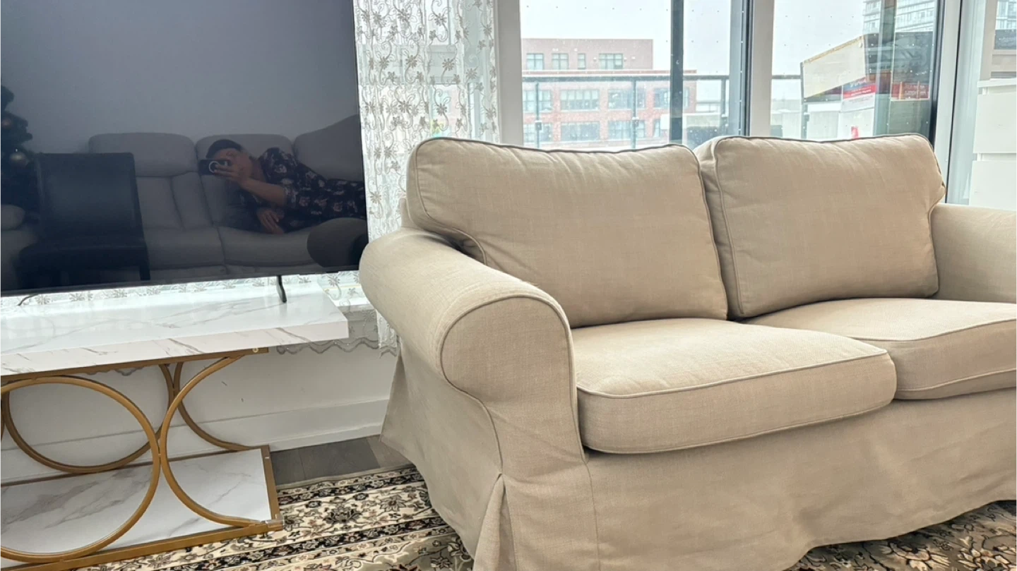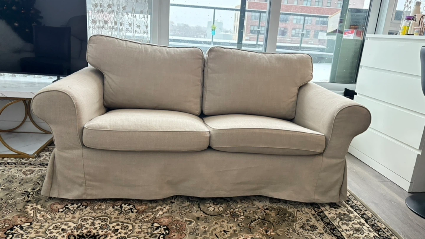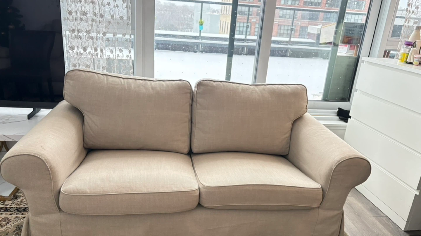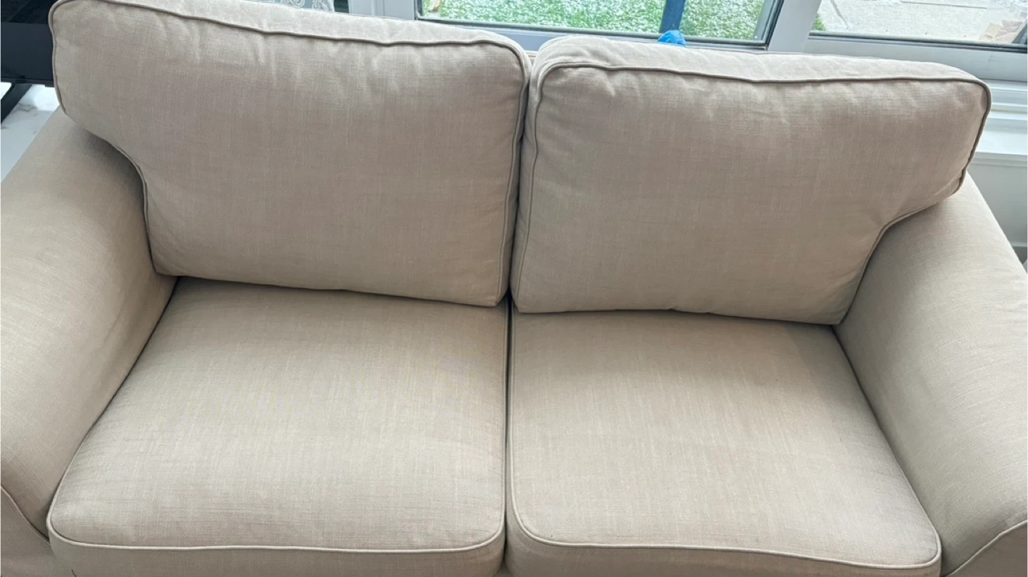 A comfortable and stylish loveseat sofa in a neutral beige colour! It's perfect for a smaller space or as an addition to a larger living room. The sofa appears to be in great shape and ready for a new home.