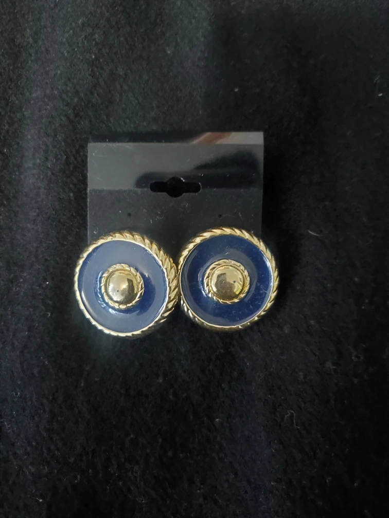 Free. Cute pair of round earrings with a navy blue and gold design. They're in great condition and ready to add a touch of elegance to your look!