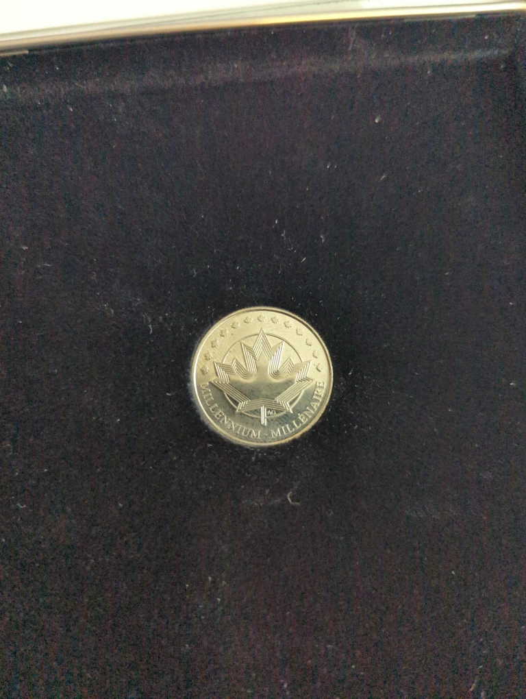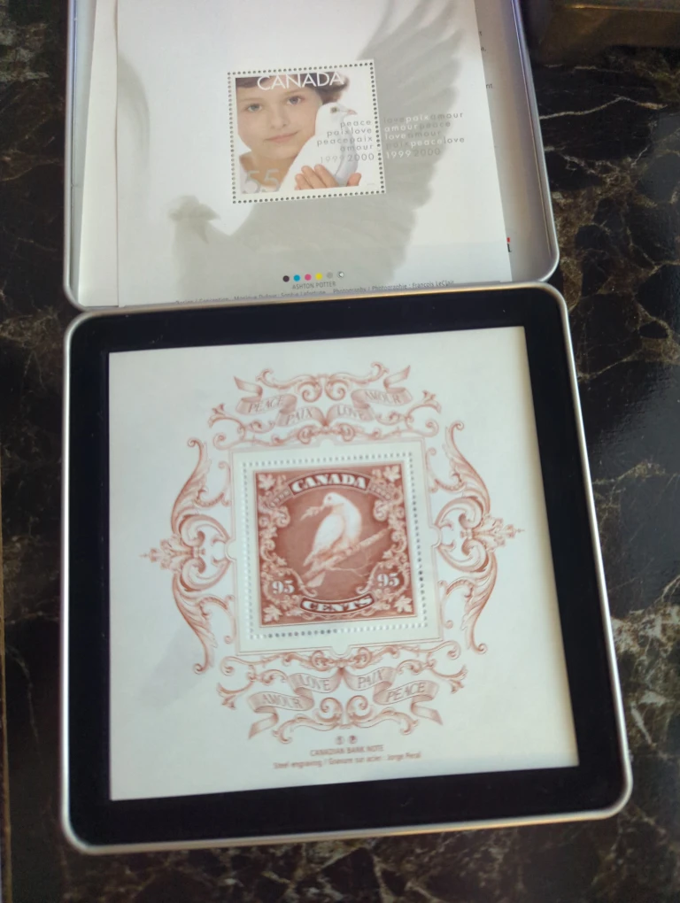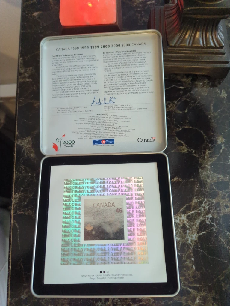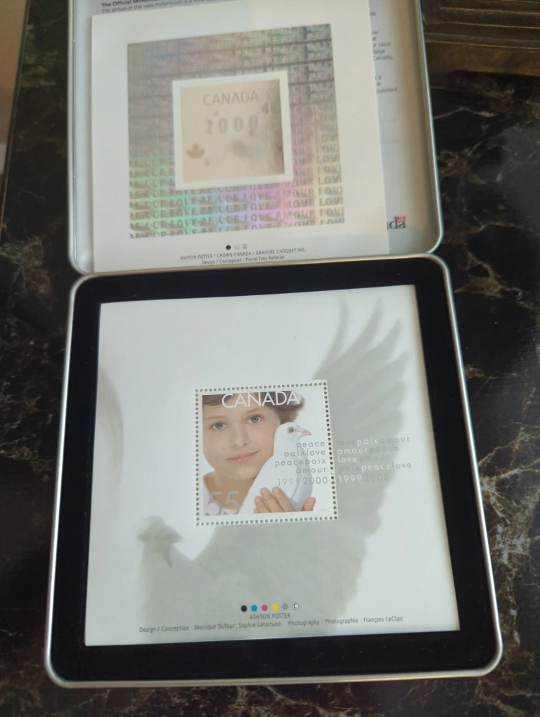 I'm offering a Canada 2000 Millennium Keepsake, complete with the original tin, stamp, coin, and information cards. The set commemorates the year 2000 with a special edition coin and stamp, and it's all in great condition. A neat piece of Canadian history to have!