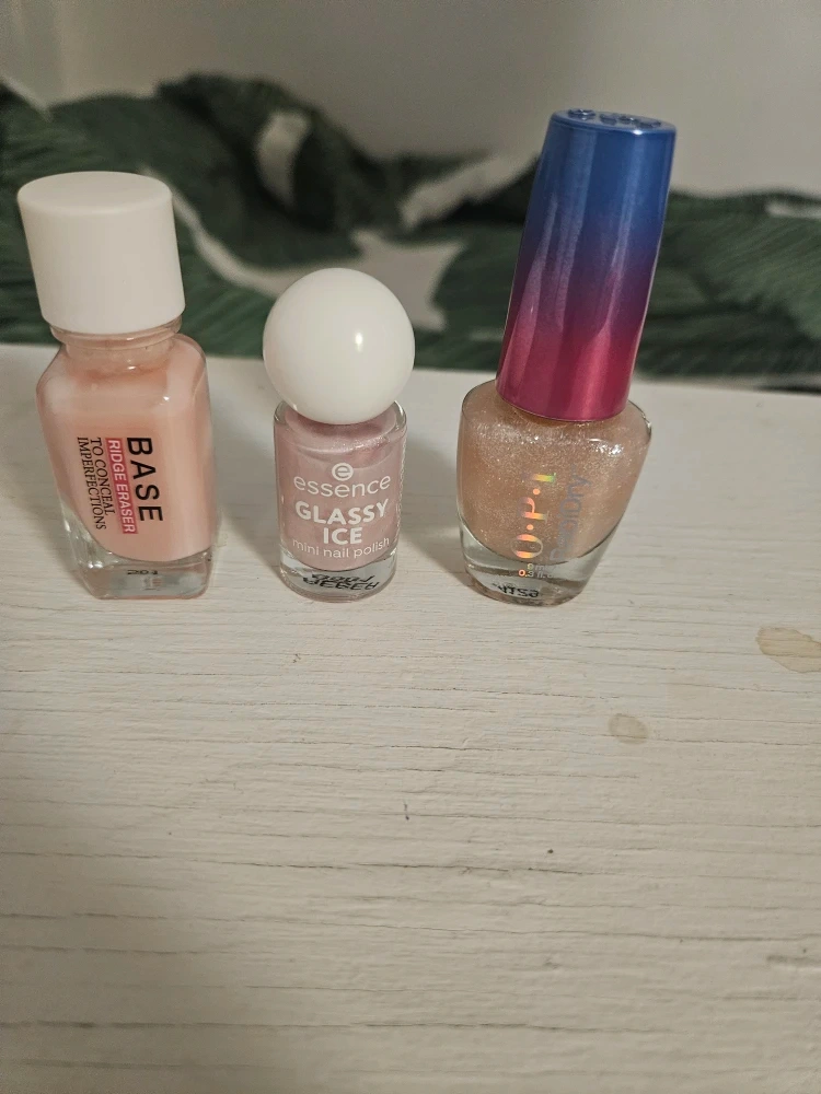 Il y a un vernis OPI RapidDry, un vernis Essence Glassy Ice, et un vernis Base Ridge Eraser. Ils sont tous en bonne condition et prêts à être utilisés