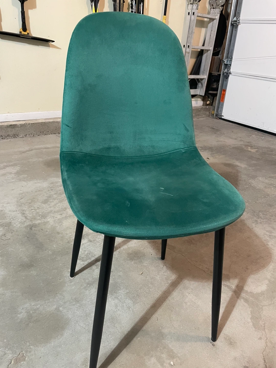 Free - 4 beautiful green velvet dining chairs! They are in good condition and would add a pop of colour to any dining space. The black legs provide a nice contrast to the rich green velvet. Perfect for your dining room or as an accent chair!