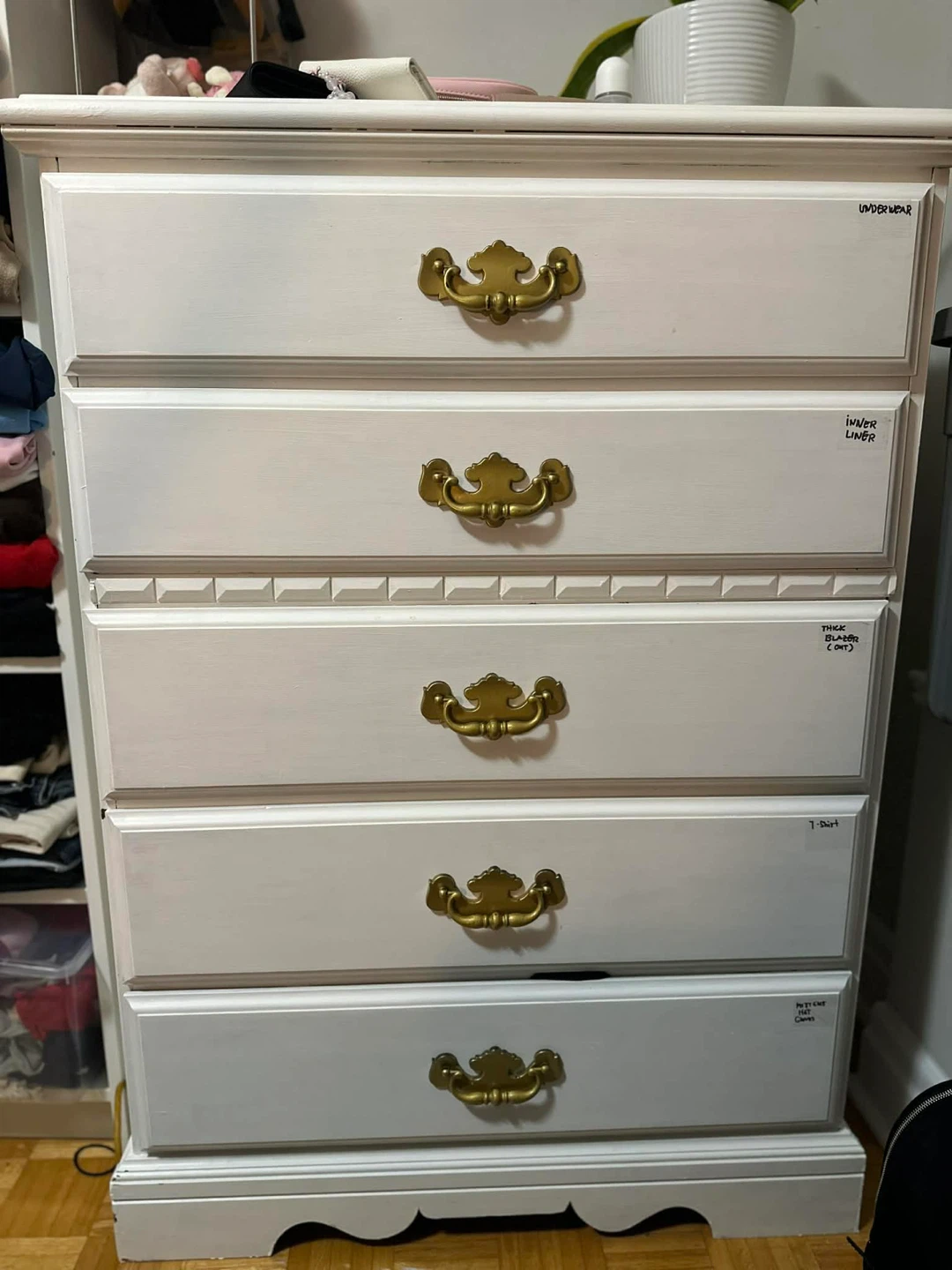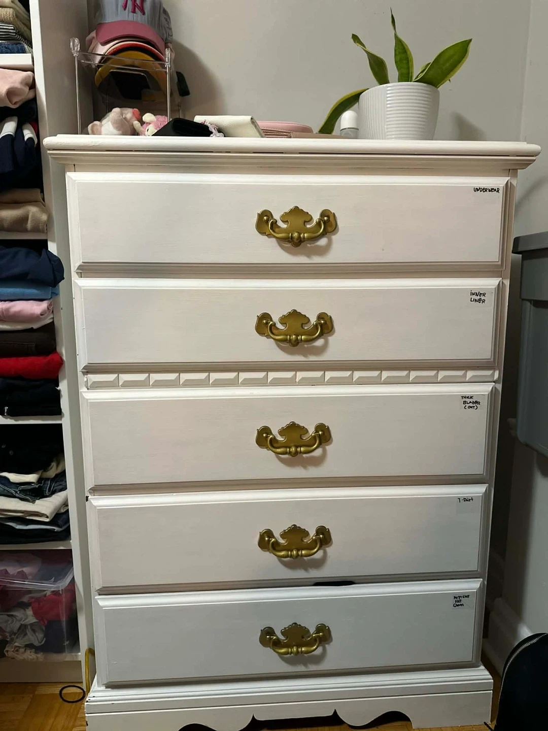 Here's a charming white dresser with five drawers, perfect for adding some extra storage to your space! It features lovely gold handles that add a touch of elegance. Each drawer is labeled for easy organization. Real wood and vintage.