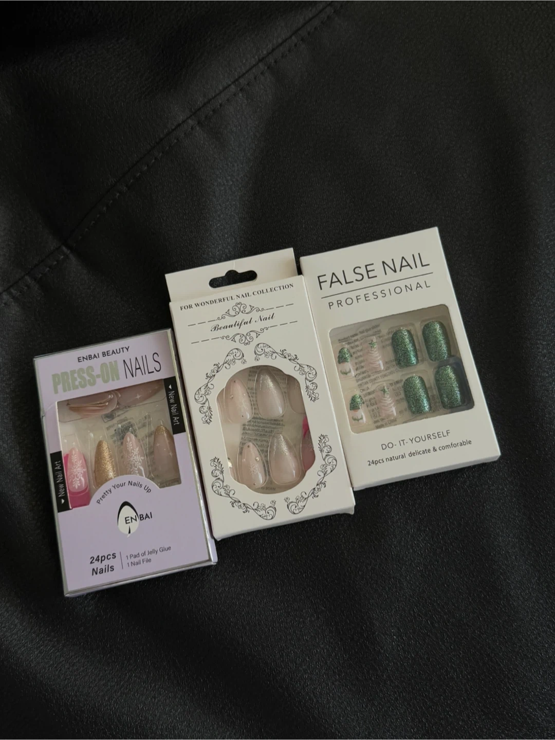 I have a 3 new sets of press-on nails for sale! Each box contains 24 pieces of nails, 1 pad of jelly glue, and 1 nail file. They're perfect for a quick and easy manicure at home