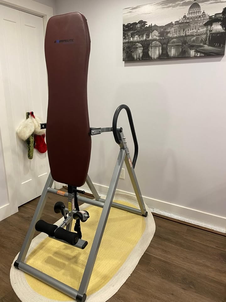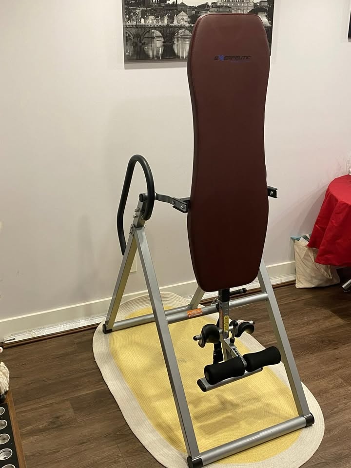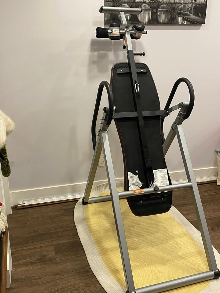 Unlock the benefits of inversion therapy with this high-quality inversion table. Perfect for those seeking relief from back pain, improving flexibility, or reducing stress. Whether you're an athlete, someone with chronic back discomfort, or simply looking to relax your muscles, this inversion table offers an effective way to enhance your well-being. Adjustable & Foldable. Adjustable Design: Easily customizable to fit your body type and preferred inversion angle. Comfortable Padding: The padded backrest ensures comfort while using, providing proper support during your sessions. Durable Build: Made with a sturdy steel frame and high-quality materials, designed to last and support your weight safely. Compact & Foldable: The table folds easily for convenient storage when not in use, making it ideal for homes with limited space. Easy to Use: Simple setup and smooth inversion mechanism, allowing you to invert from a 90Β° angle for optimal back decompression. Benefits of Inversion Therapy: Relieves back pain and pressure on discs and nerves Improves circulation and posture Increases flexibility and joint health Reduces muscle tension and stress This is an ideal tool for those suffering from back pain, or for anyone looking to improve their flexibility and overall spinal health. πŸ“ Pickup: Near Winston Churchill and Britannia Intersection, Mississauga (Ontario)
