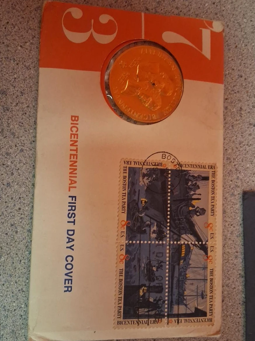 Selling a Bicentennial First Day Cover featuring a commemorative coin and stamps related to the Boston Tea Party. A unique piece of history for collectors!