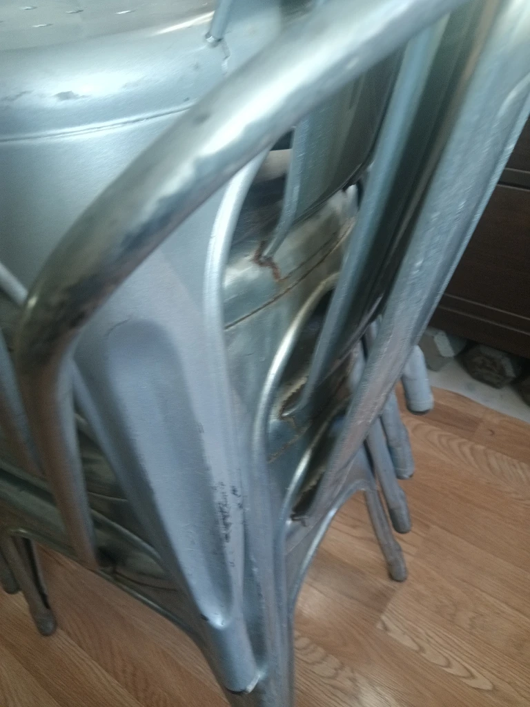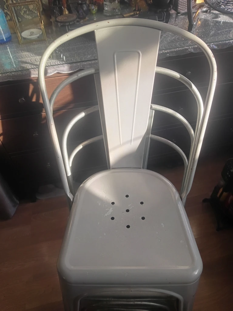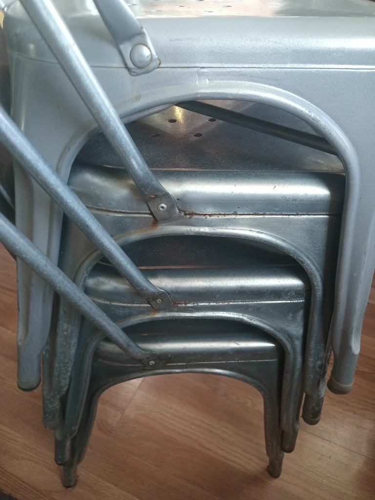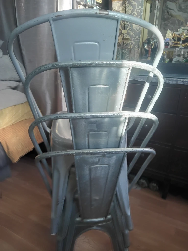Selling a set of four Tolix style metal dining chairs. They're a stylish and sturdy addition to any dining space! These chairs have a cool, industrial look and are perfect for everyday use.