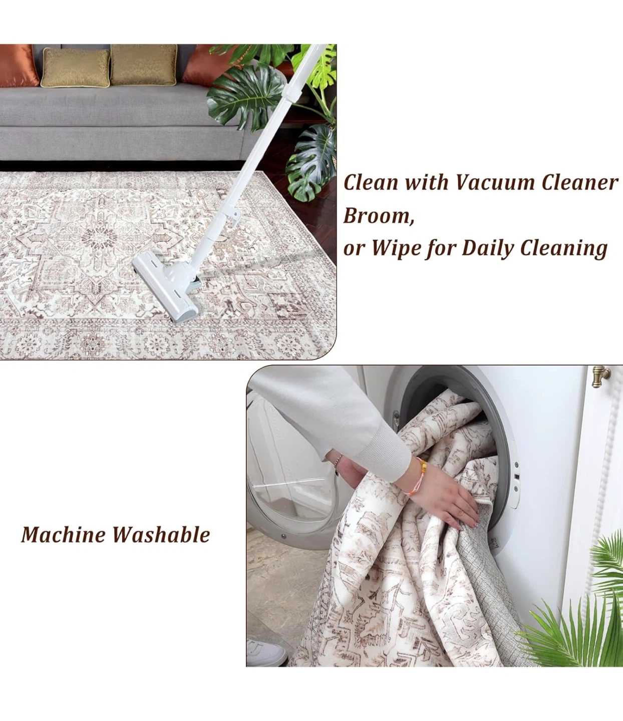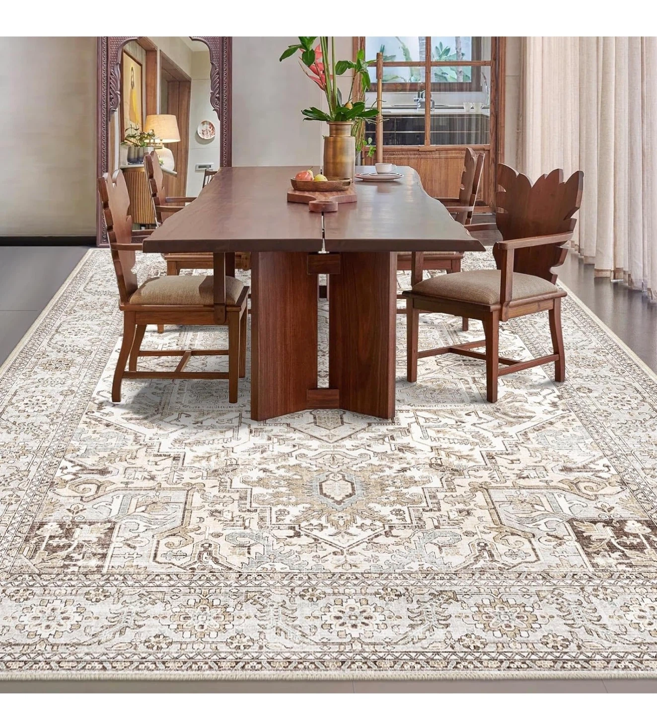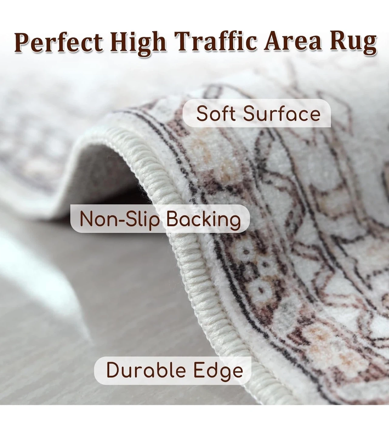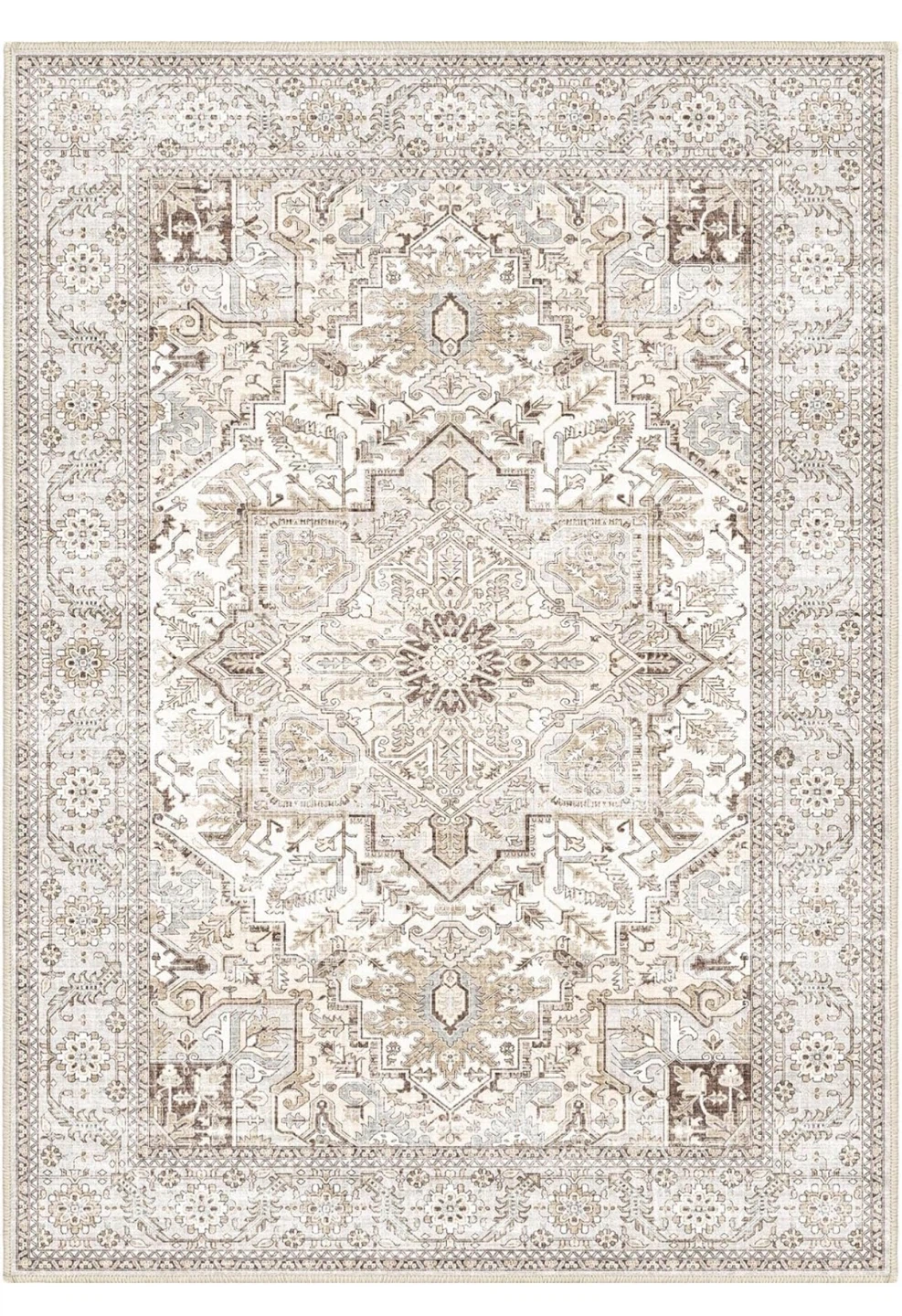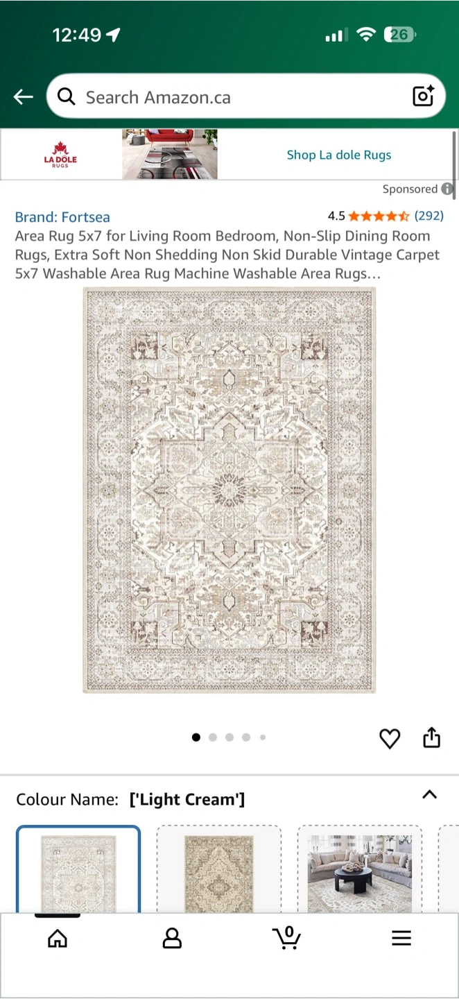 Selling a Fortsea area rug, sized 5x7. The colour is a lovely light cream. It's non-shedding and has a non-slip design. It's also machine washable for easy cleaning!