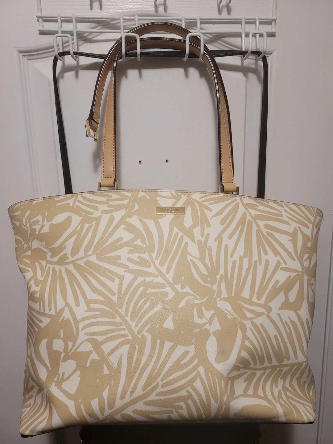 beautiful large size Kate spade with one broken strap which needs to be fixed. original. strap got pulled by accident and broke. hardly used. otherwise super sturdy and extremely spacious. no other damage or scratches. anyone who can get the strap repaired can flaunt the handbag for a really long time.