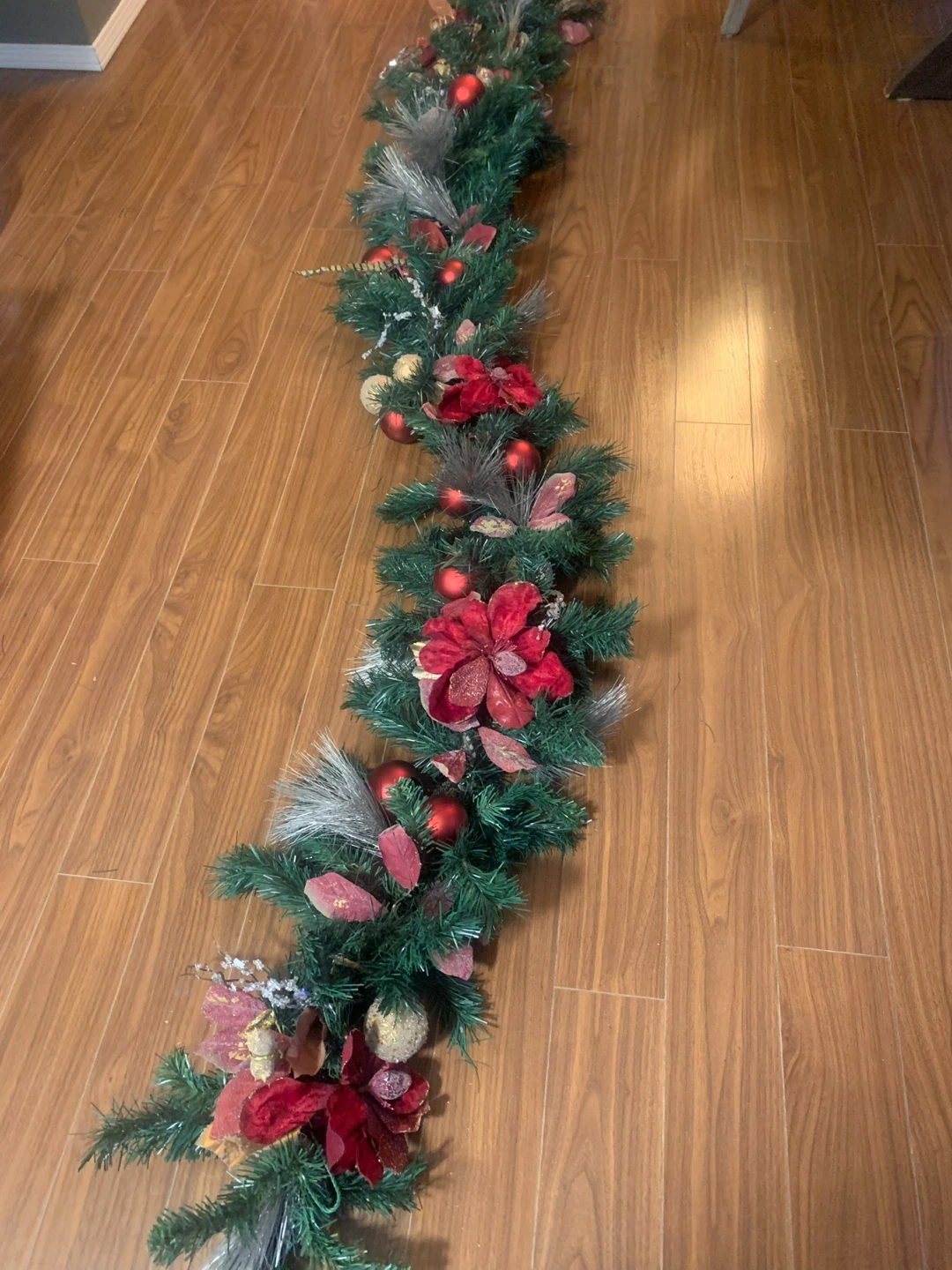 Selling a beautiful Christmas garland to add some festive cheer to your home! It features lovely red ornaments and decorative accents. Perfect for draping across a mantel, banister, or doorway to create a warm and inviting atmosphere for the holidays