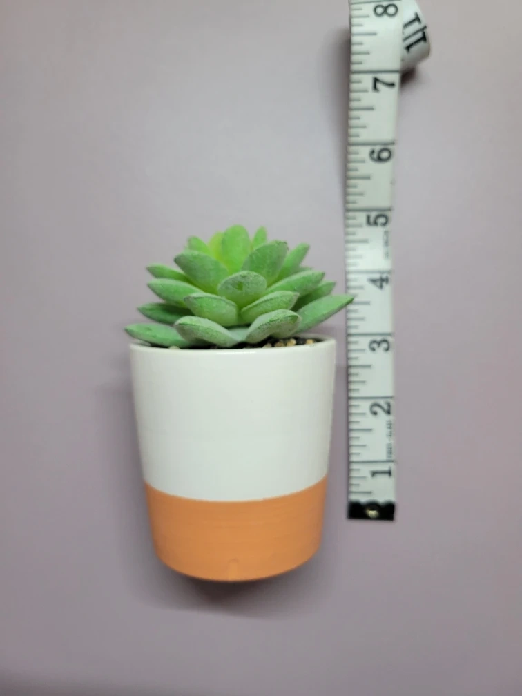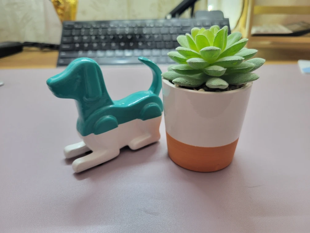 Here's a cute teal and white dog figurine paired with a faux succulent in a pot! The pot has a nice orange accent at the bottom. Perfect for adding a touch of charm to any space. From smoke-free home.