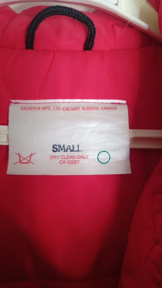Selling a Calberta MFG. LTD. winter parka in a vibrant red colour. It's a size small and features a fur-trimmed hood. The tag indicates it should be dry cleaned only. Perfect for staying warm this winter season!