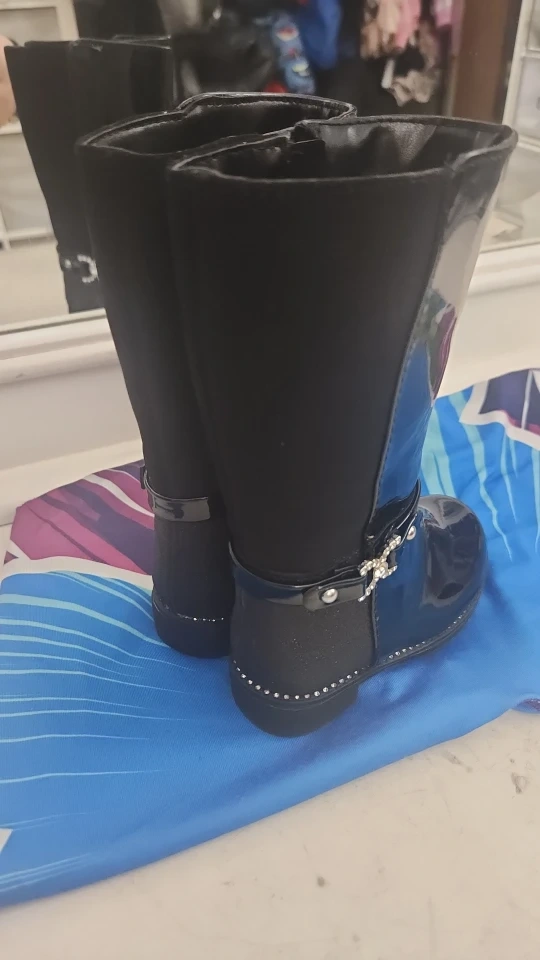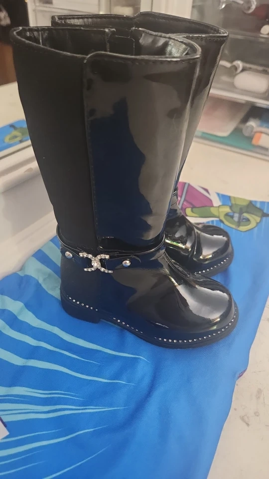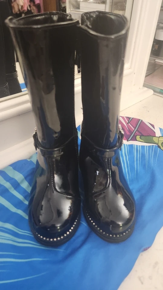 These are a pair of stylish black patent leather boots. They feature a rhinestone detail around the sole and a decorative buckle. Perfect for adding a touch of shine to any outfit! so adorable, she only wore it to take pictures so it's still brand new