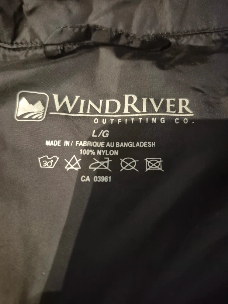 Selling a Wind River Outfitting Co. jacket in size L/G. It's made of 100% nylon and is lightweight and portable. Perfect for those breezy days!