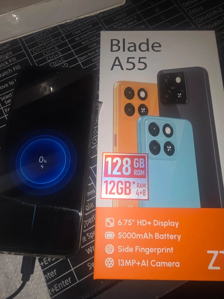 Selling a ZTE Blade A55 smartphone. It features 128GB ROM and 12GB RAM (4+8). It also has a 6.75" HD+ display, a 5000mAh battery, side fingerprint sensor, and a 13MP+AI camera
