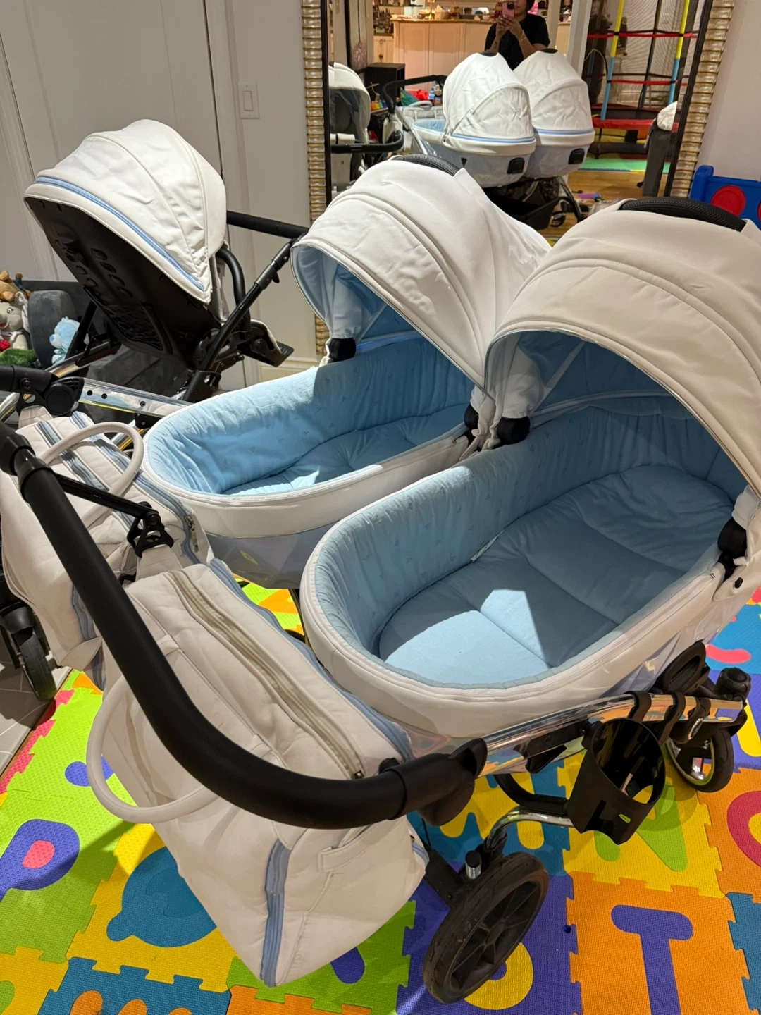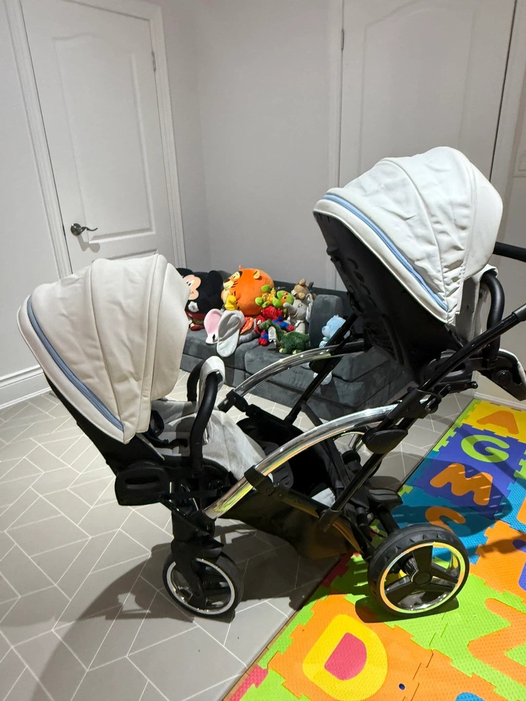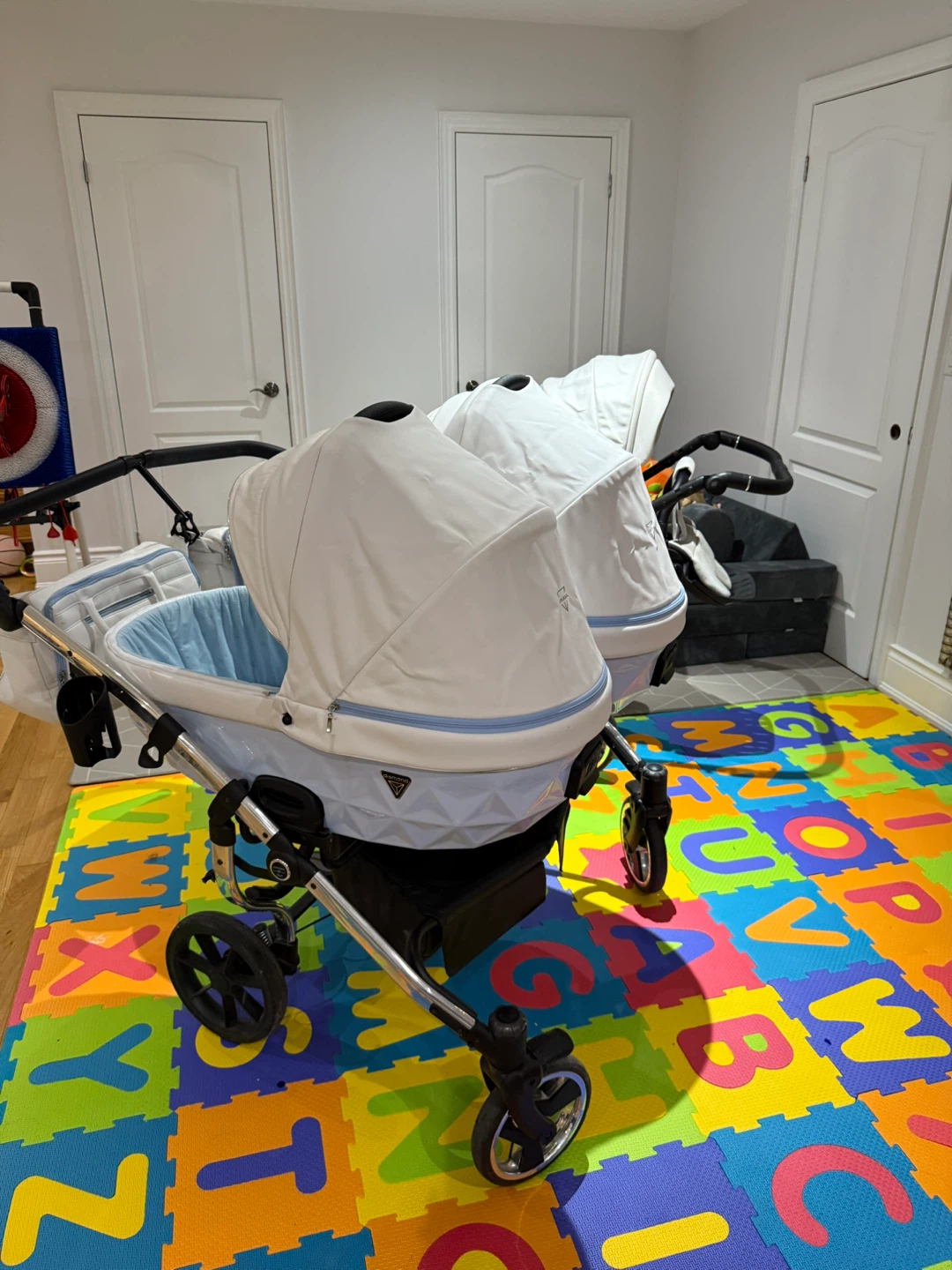 Selling a Junama Diamond Duo twin stroller! It features a unique diamond-shaped base and a sleek design. The stroller is in good condition and ready for new adventures with your little ones. Comes with two bassinets and two seats, perfect for twins or siblings close in age