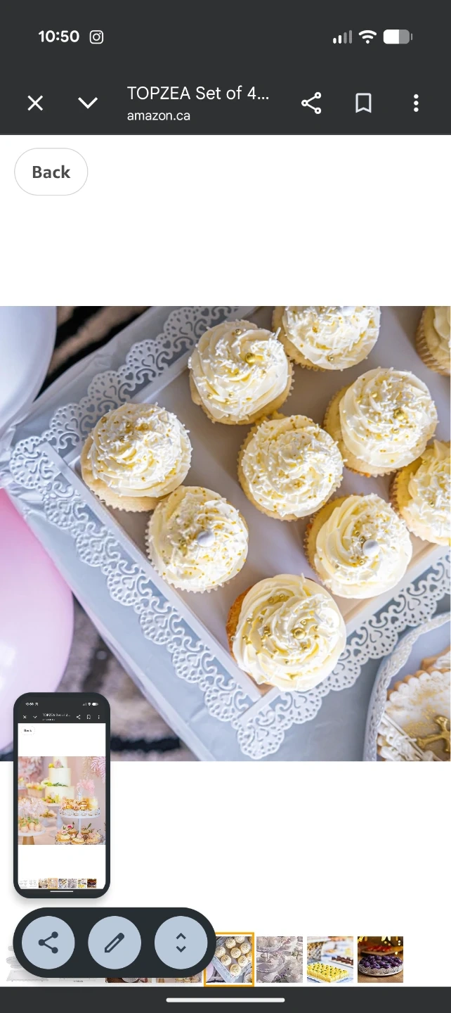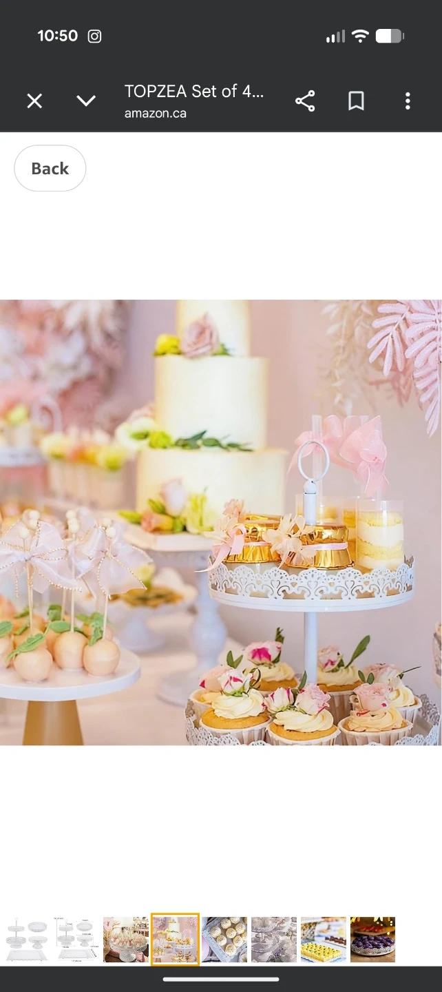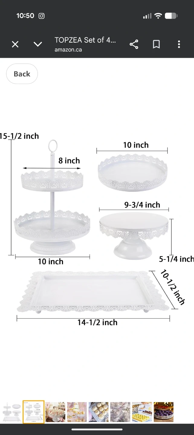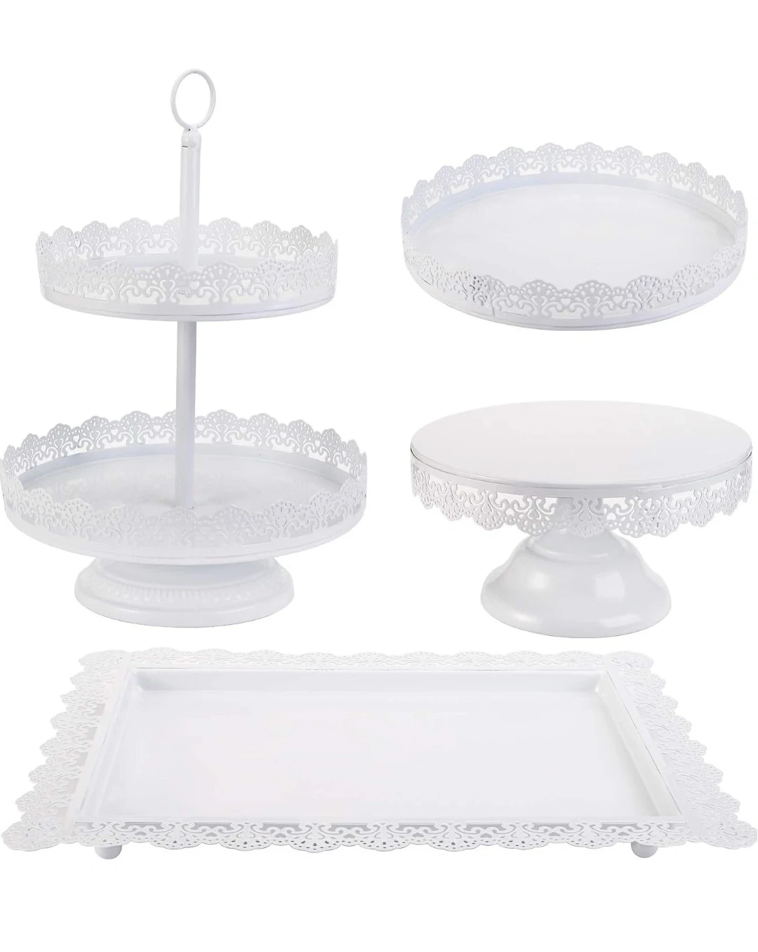 This set includes a two-tier cupcake stand (15-1/2 inches tall, 10 inches wide), a 10-inch cake stand, a 9-3/4 inch cake stand, and a rectangular tray (14-1/2 inches long, 10-1/2 inches wide). All pieces are white metal with decorative lace edges. Perfect for serving desserts at parties or gatherings!