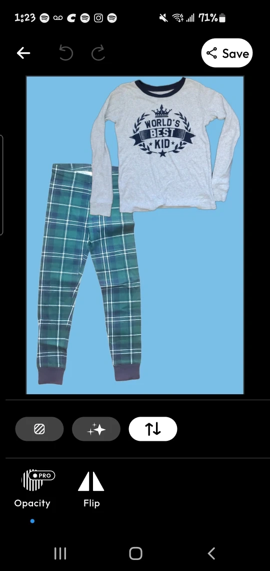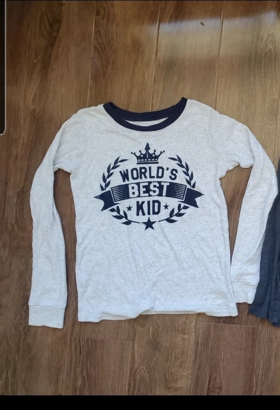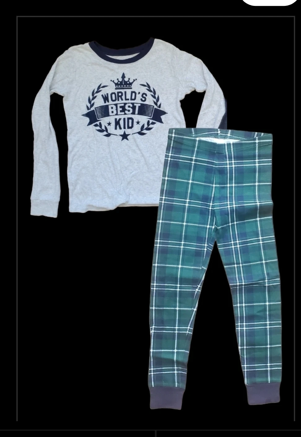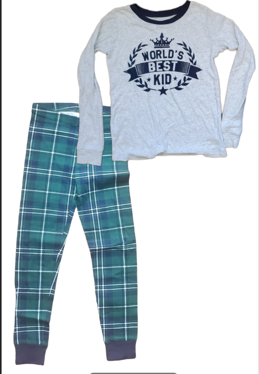 The set includes a long-sleeved top with a cute "World's Best Kid" design and plaid pants.