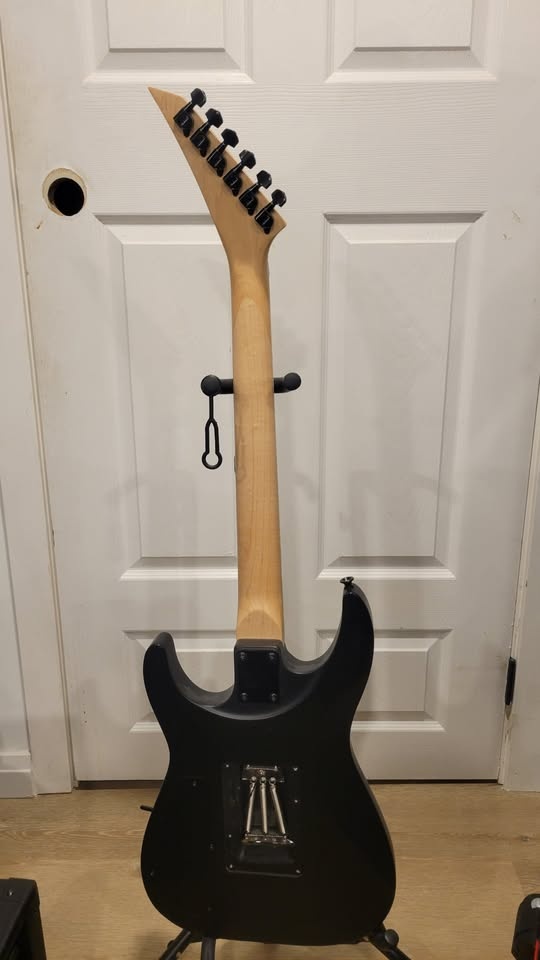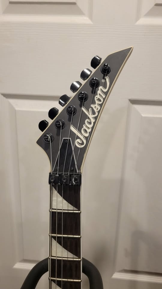 Jackson JS32 DKA in Satin Black with a poplar body, maple neck, and amaranth fingerboard. It has two Jackson high-output humbuckers and a 3-way pickup switch. Fast and sharp-looking, great for heavy riffs and lead playing.