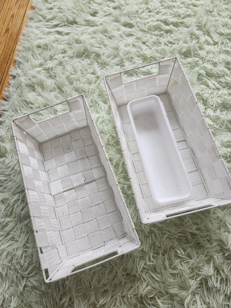 Selling a set of two white woven storage baskets. They're perfect for organizing your home. One basket has a white plastic tray inside. They are in good condition and ready for a new space