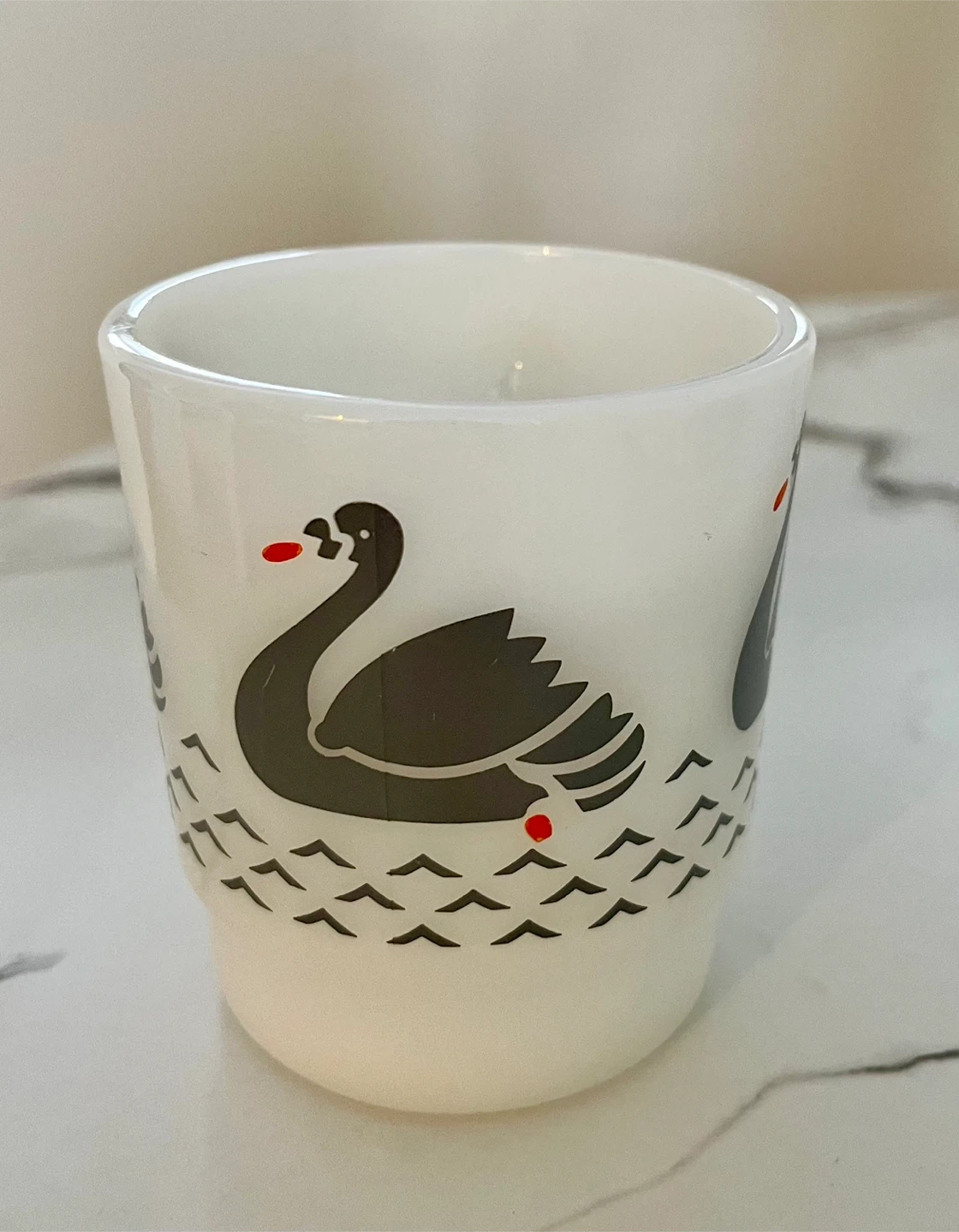 Selling a vintage Hazel Atlas milk glass mug featuring a grey swan design! It's in great condition and would be a lovely addition to any collection