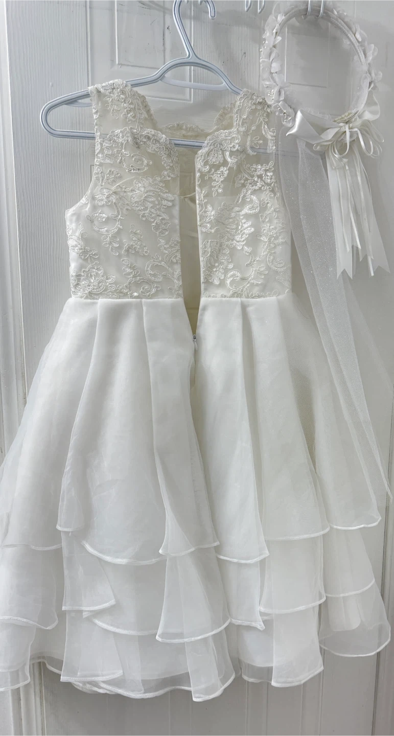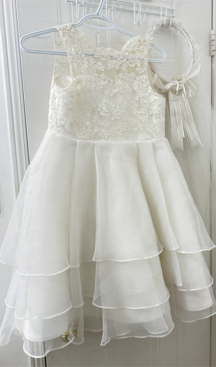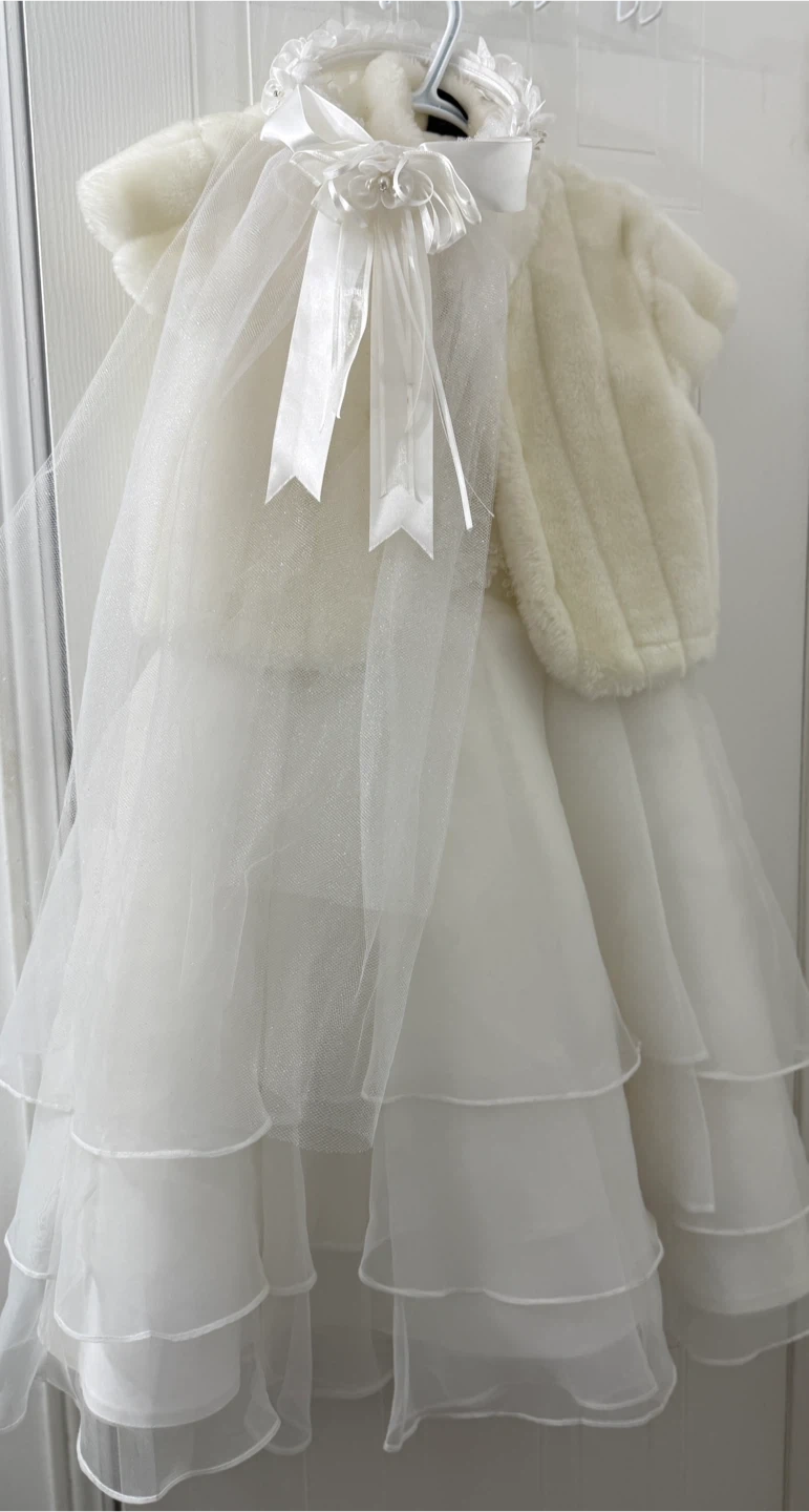 A beautiful white dress with a matching headband and bolero jacket. Perfect for a special occasion! The dress has a layered skirt and delicate lace detailing on the bodice. The bolero adds a touch of warmth and elegance. It's in great condition and ready for its next event