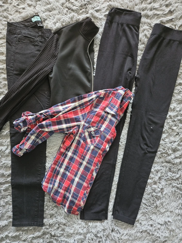 Also included is black zip up sweater, plaid blue notes button up shirt, and 2 pairs of tights (good/fair condition.