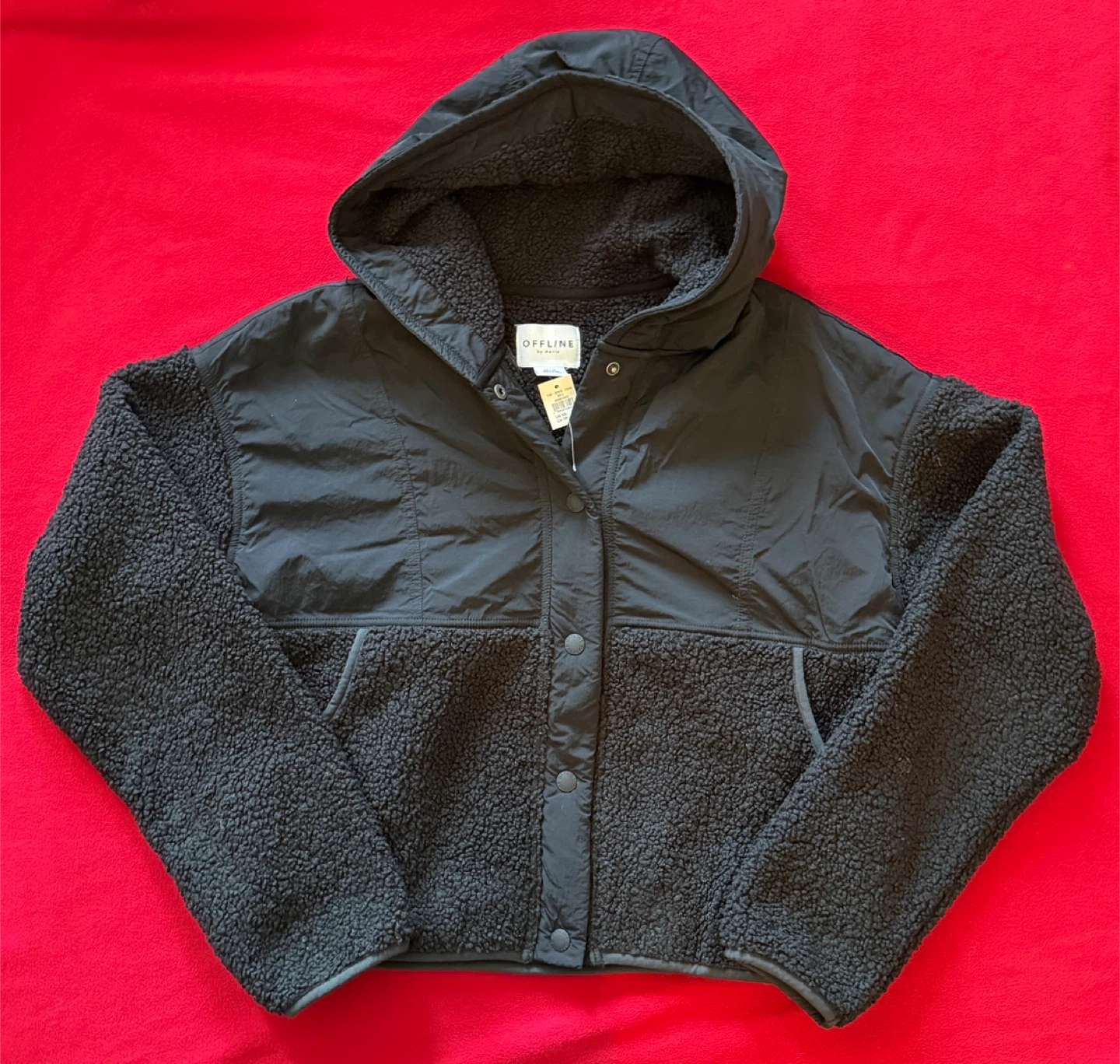 Check out this Aerie OFFLINE jacket! It features a cozy sherpa trim and a hood, perfect for cooler weather. The jacket is in great condition and ready for a new owner. It's a stylish and comfortable piece to add to your wardrobe!