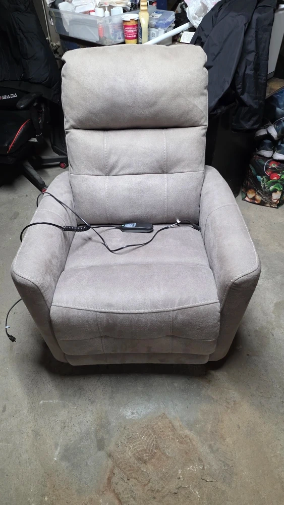 Selling a comfy beige electric recliner chair. It's in good condition and ready for a new home! The chair features a wired remote control for easy reclining