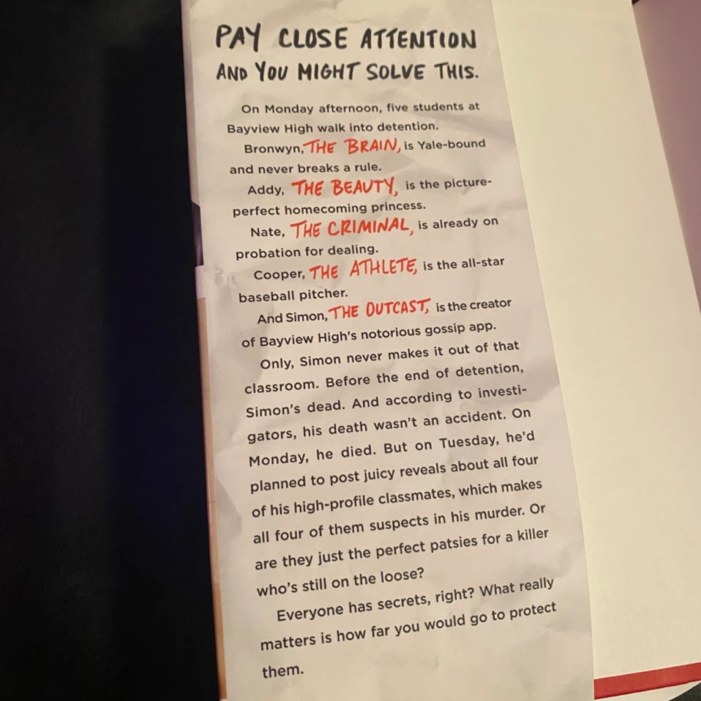 Selling the bestselling novel “One of Us Is Lying" by Karen M. McManus. This is a hardcover in like-new, read once condition. Excellent thriller - The Breakfast Club meets Knives Out! 5 kids enter detention and one ends up dead. Everyone has a motive. Who is the killer?