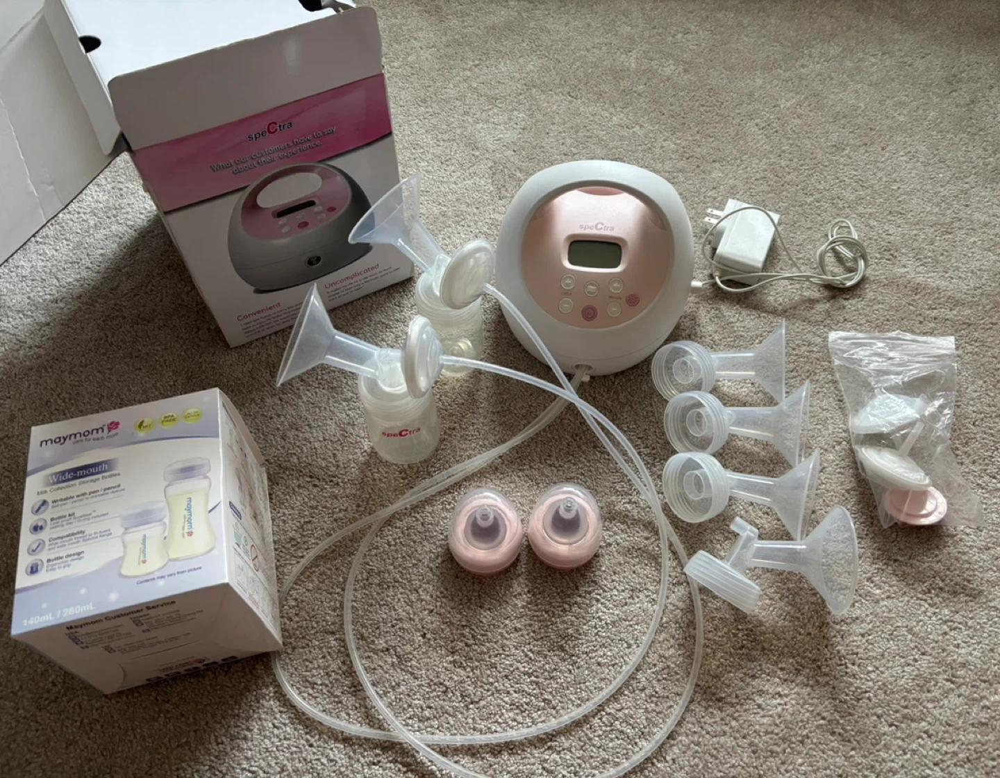 Selling a Spectra breast pump, in great shape! Comes with 24mm and 28mm flanges. Also includes Maymom wide-mouth milk collection storage bottles and maymom 21mm flanges, as pictured. Comes with the box!