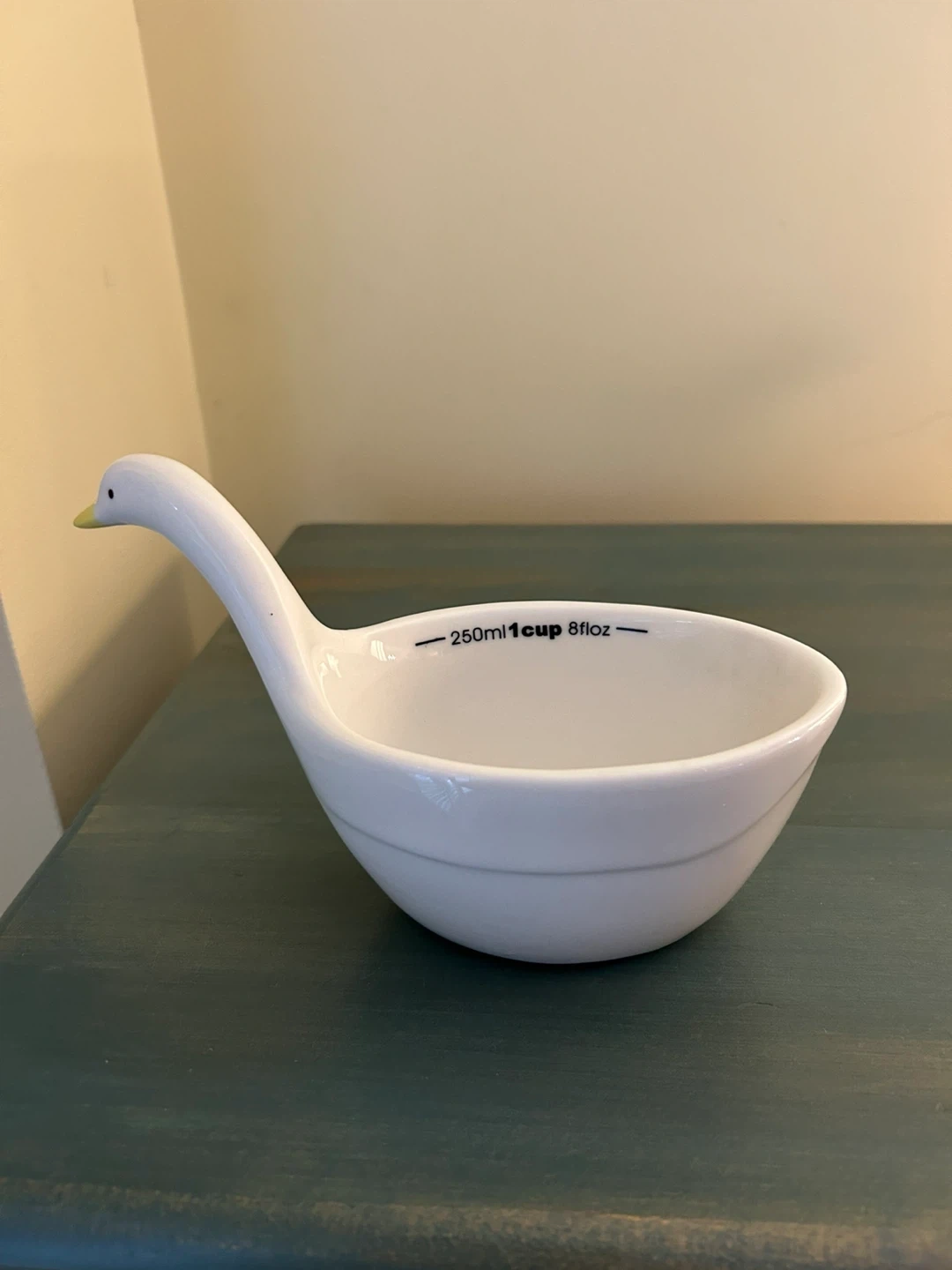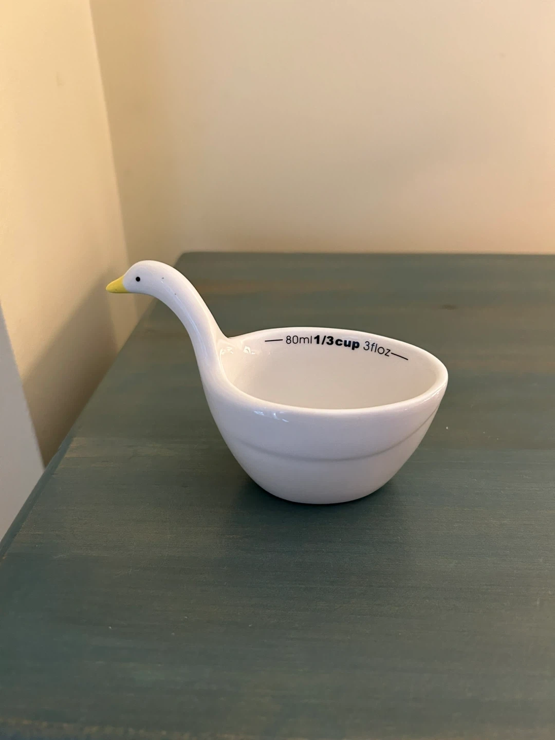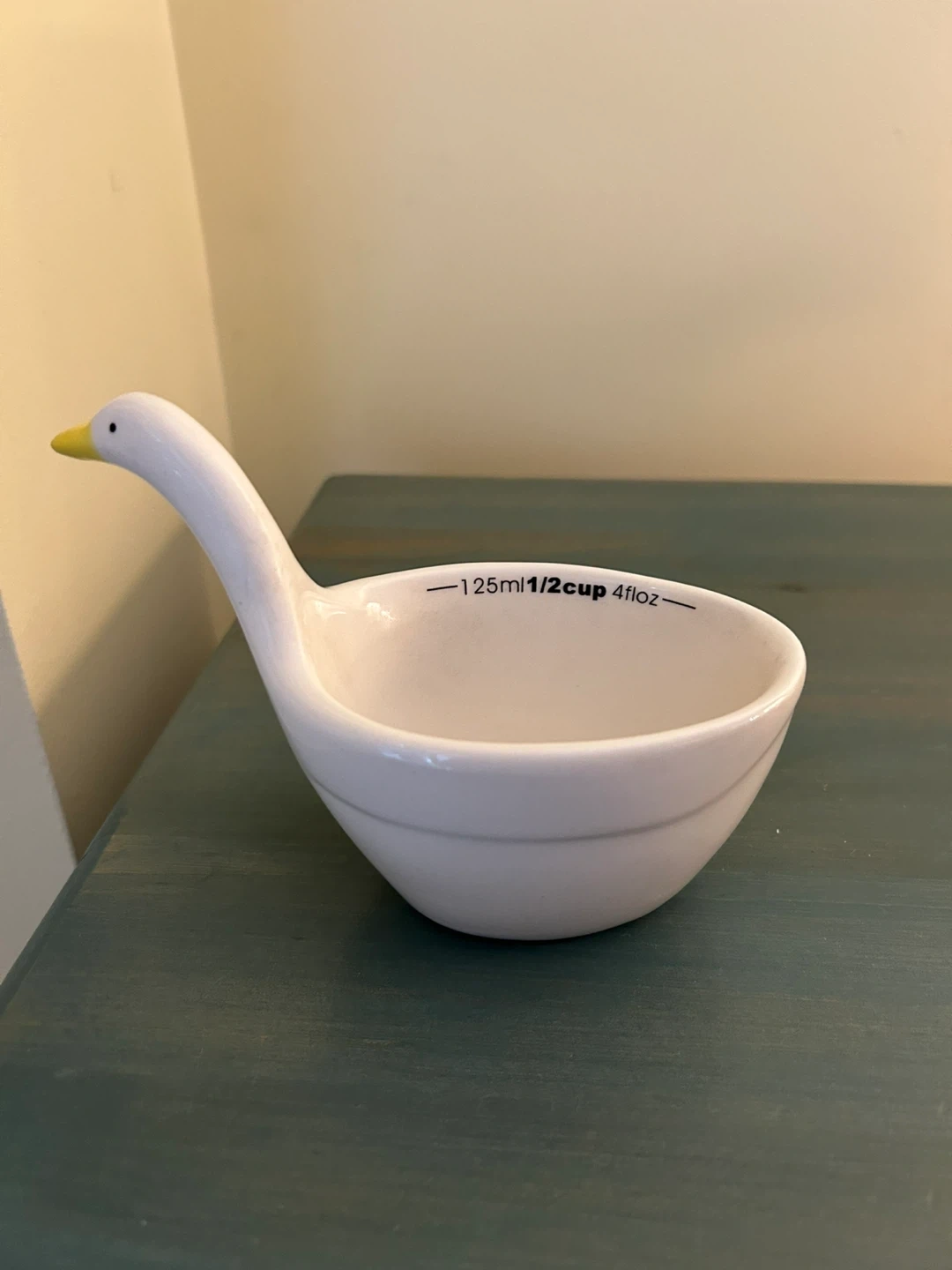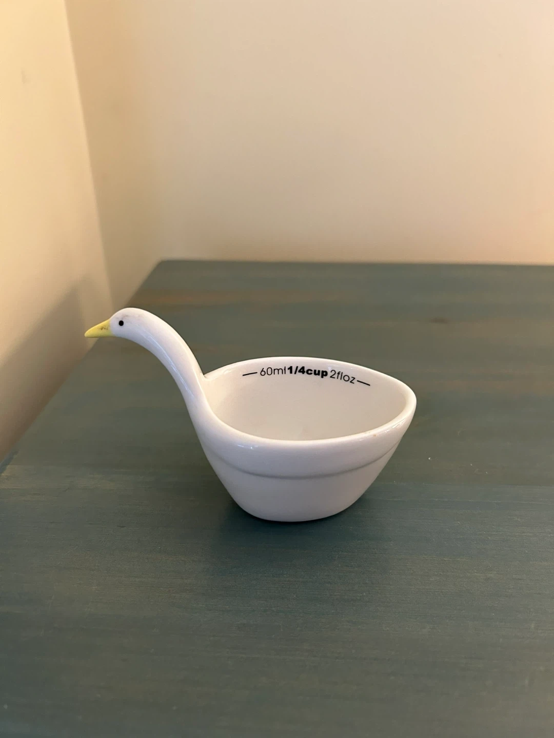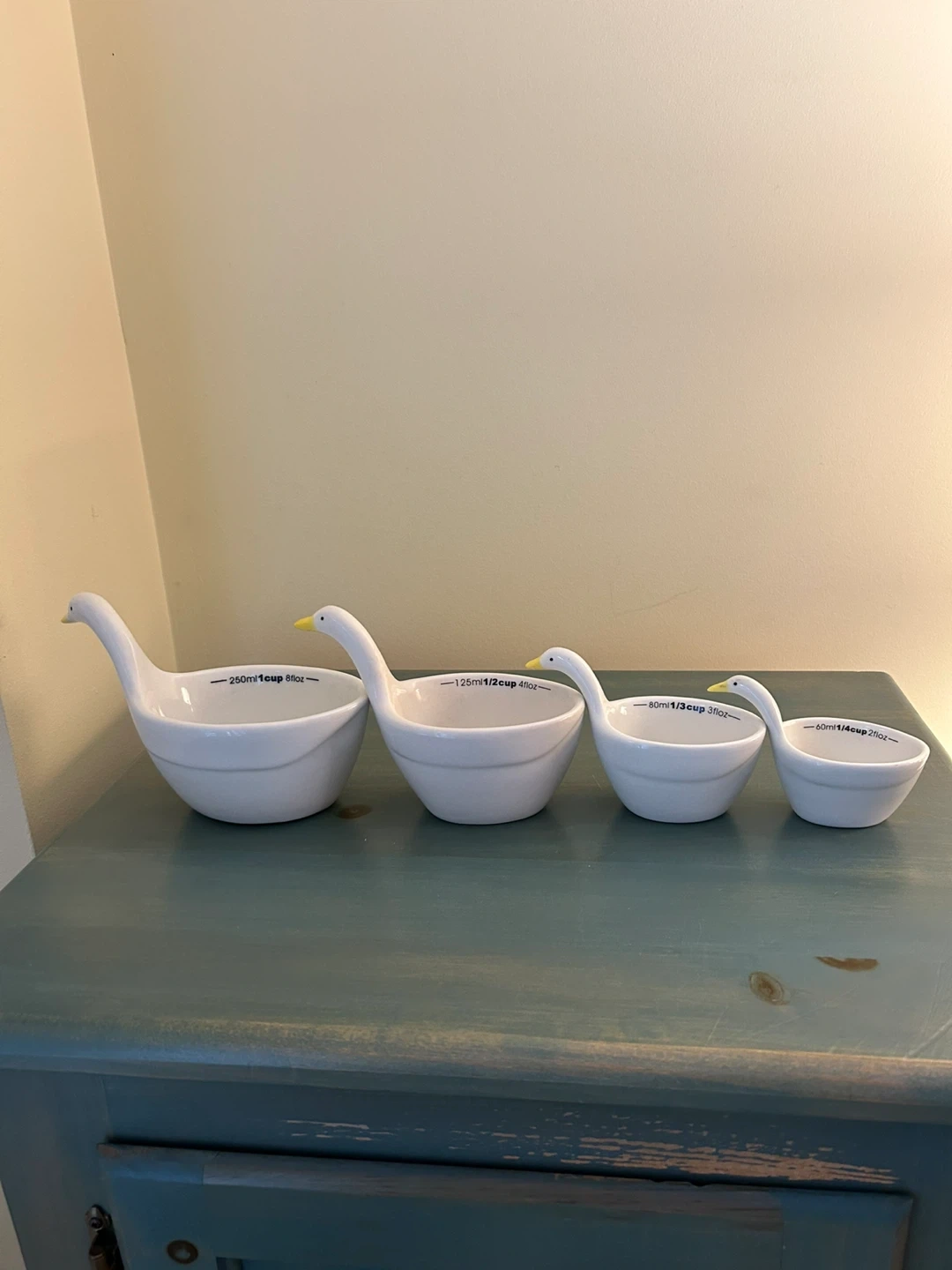 Four Nesting Four Geese/Duck Measuring Cups including 1c , 1/2c, 1/3c, 1/4c. Measurements of the largest (H 5”x W 3.75”x L 8.25”) Excellent condition no signs of wear.
