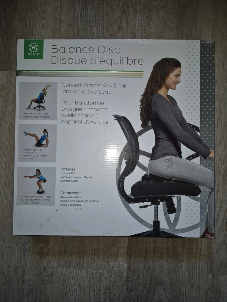 I'm selling a Gaiam Balance Disc! It helps convert almost any chair into an active seat. Included is the balance disc, a pump with an inflation needle, and an exercise guide. It's a full-body workout tool to help improve posture and strengthen your core and back