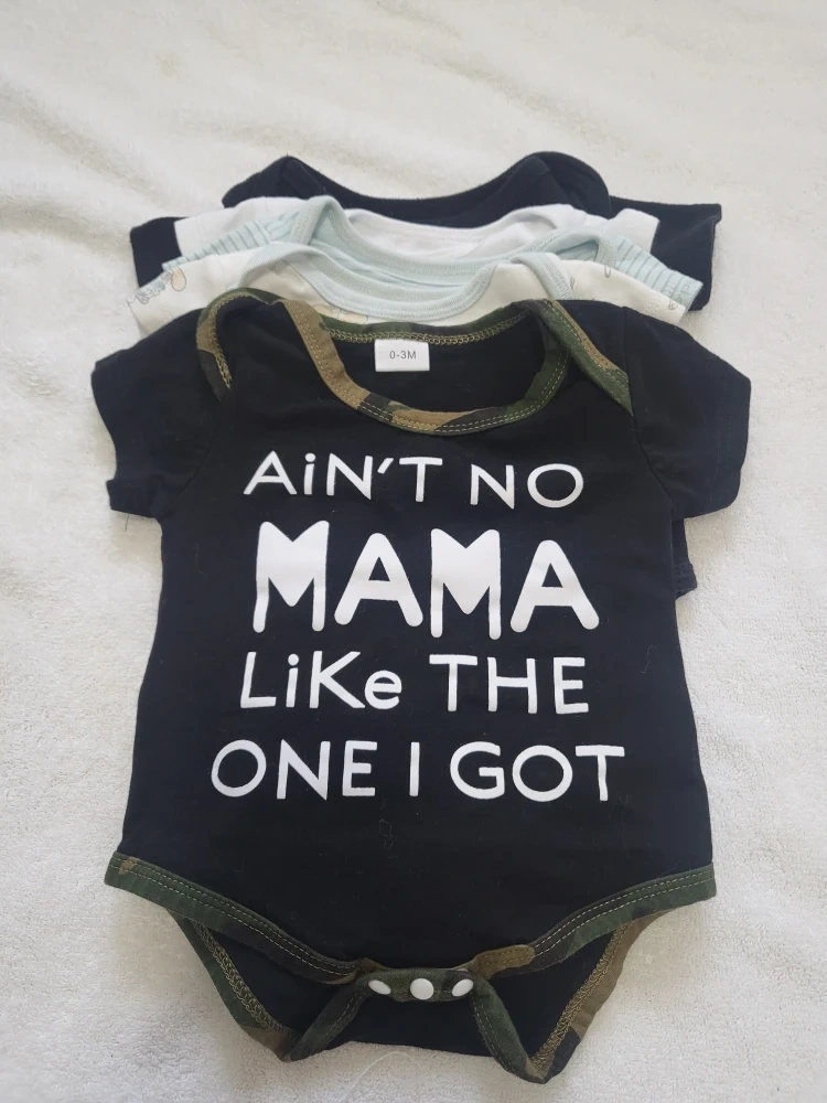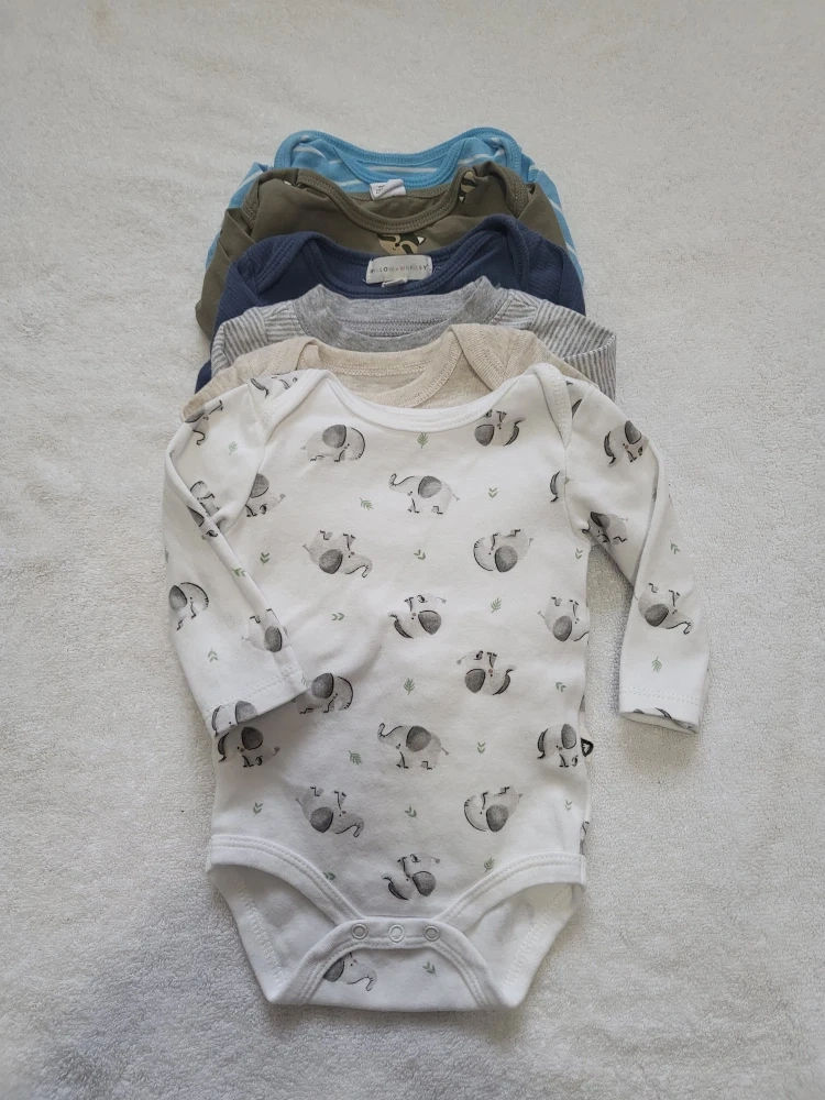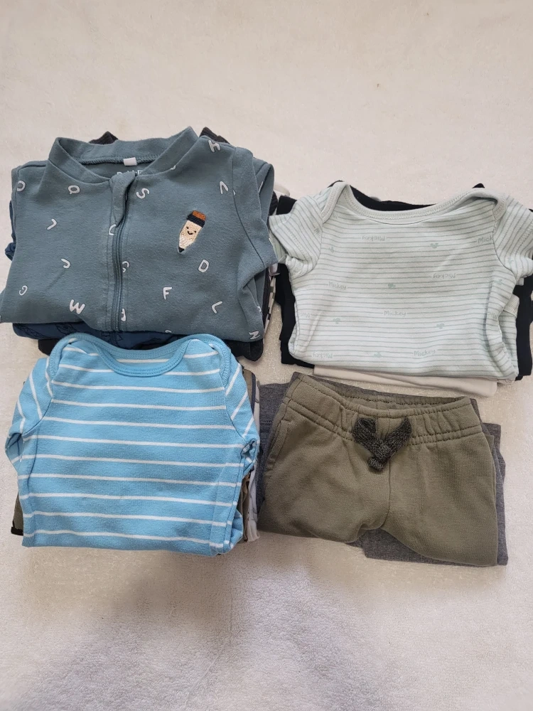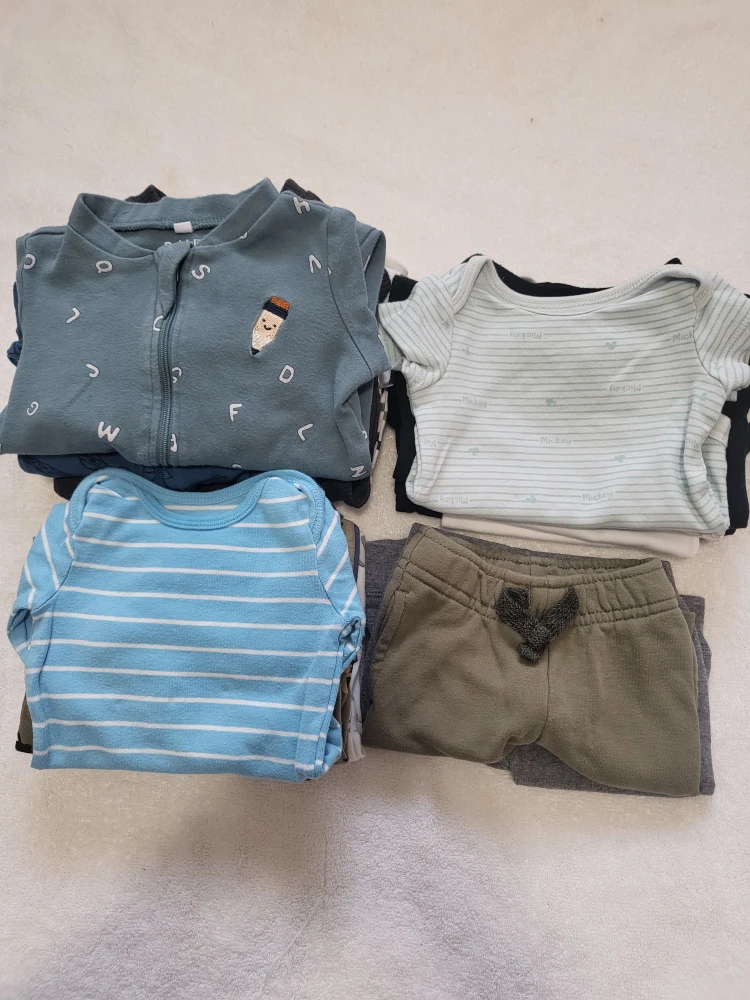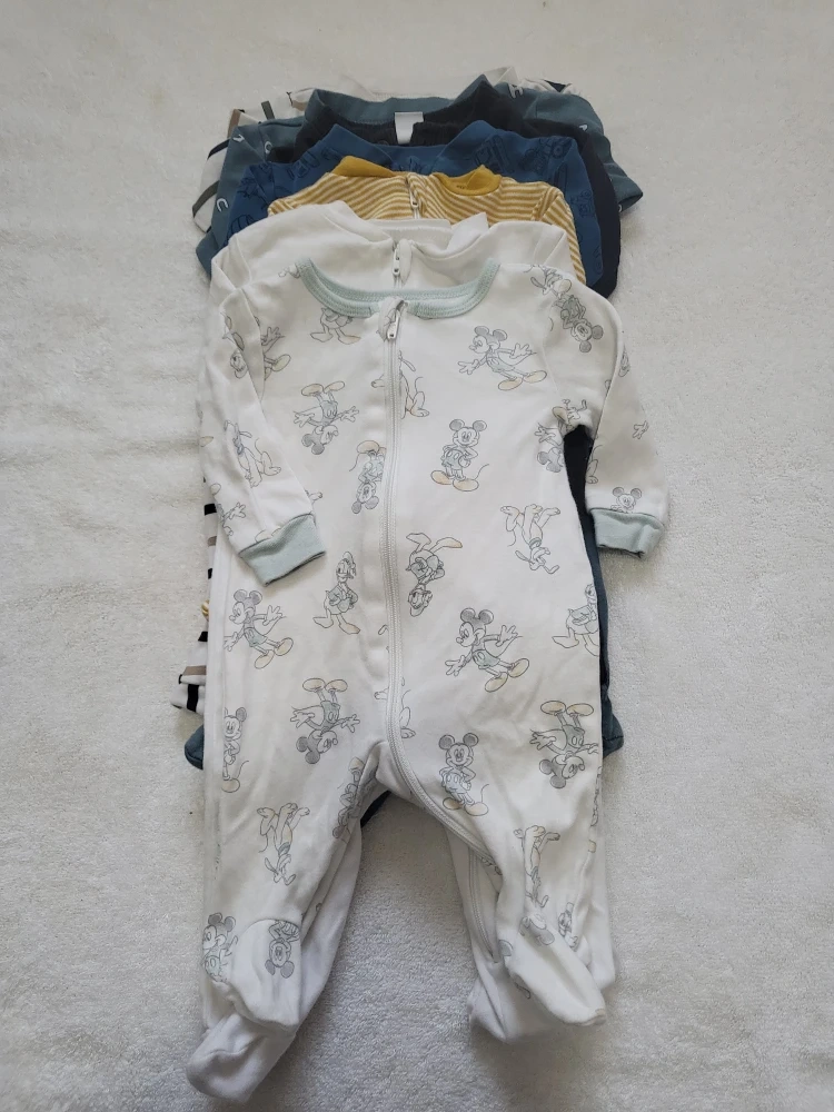 A mixed lot of baby clothes, mostly size 0-3 months. Includes bodysuits, pants, and sleepers in various colours and patterns, including some with Mickey Mouse and elephant designs. A total of 21 items Perfect for your little one!