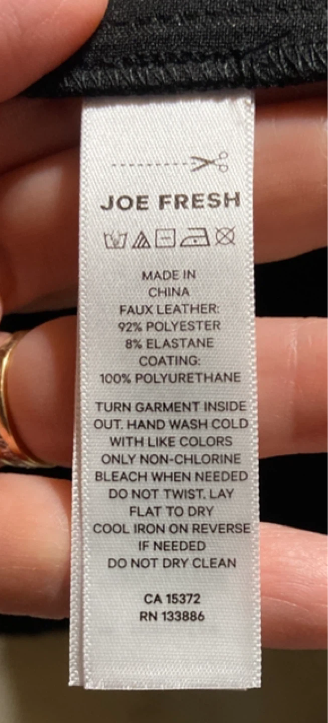 - Faux Leather: 92% Polyester, 8% Elastane