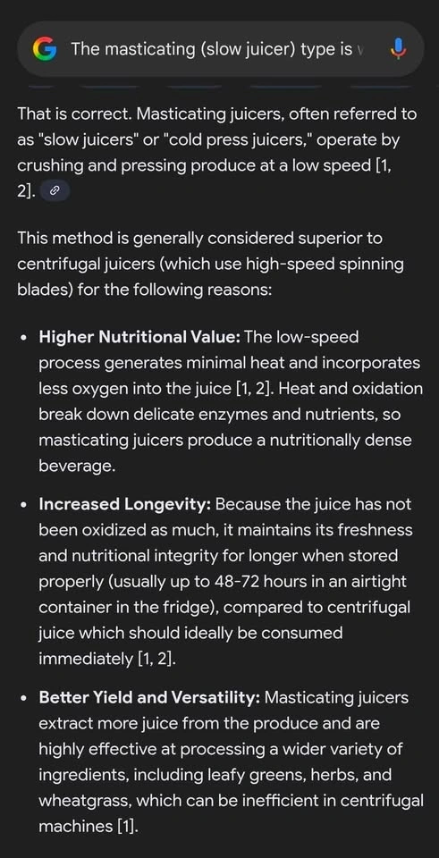 Masticating (slow juicer) type is widely considered a superior juicer, especially if your priority is high nutritional value and juice longevity.