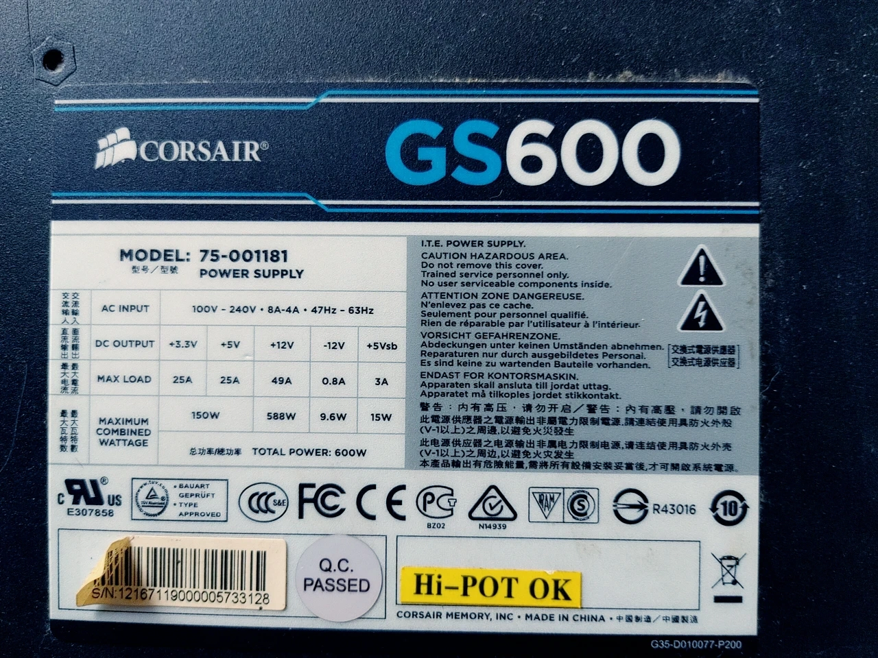 Selling a Corsair GS600 power supply. It's in good working condition and ready to power your next build! Model number is 75-001181. It provides a total power of 600W, with various DC outputs for different voltage levels. Check the photos for more details!