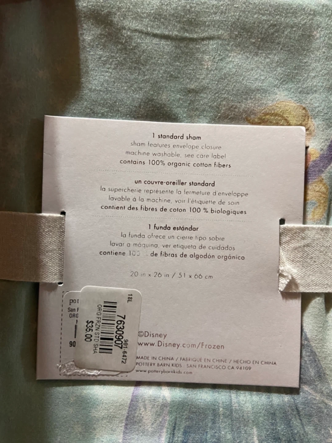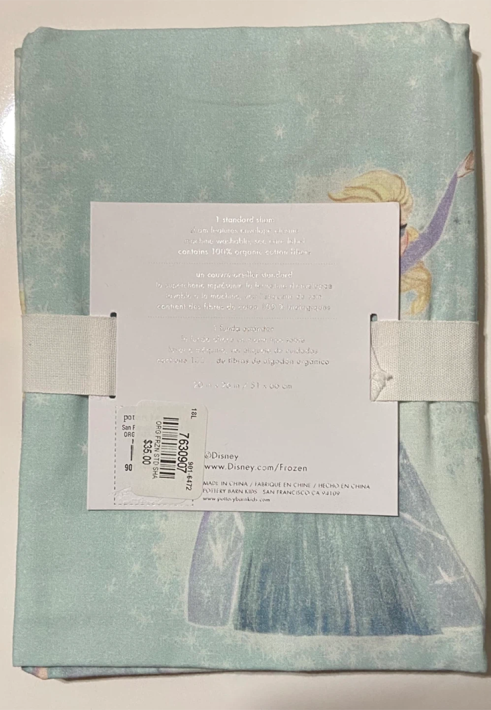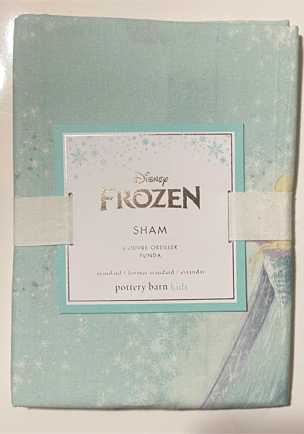 This is a Disney Frozen sham from Pottery Barn Kids! It's in standard size (20 in x 26 in / 51 x 66 cm). The sham features an envelope closure and is machine washable. It contains 100% organic cotton fibres. Originally bought for $35.00