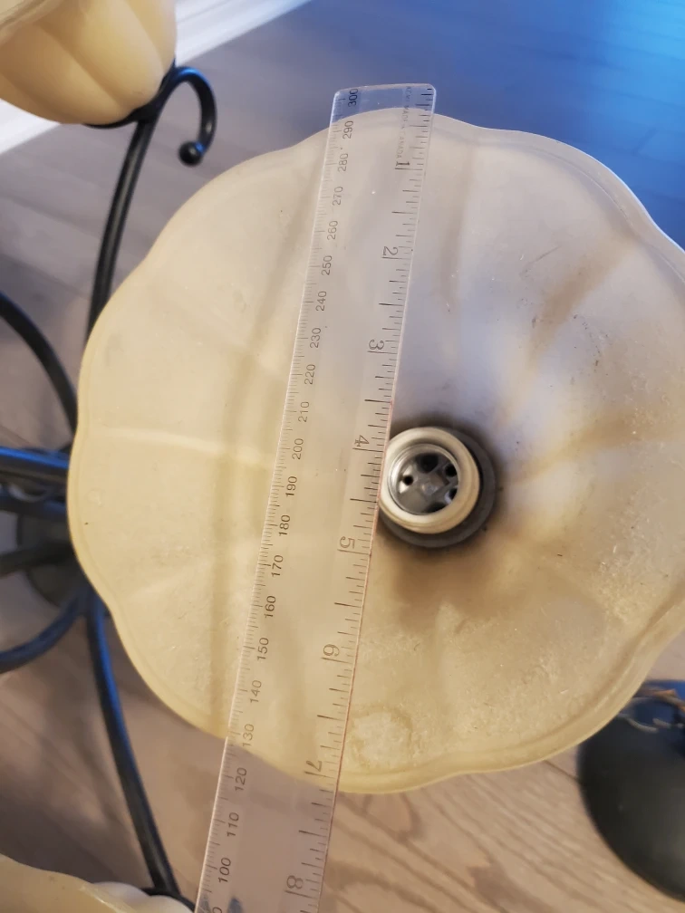 Here's a chandelier with five lights, perfect for adding a touch of elegance to any room. The shades are a soft, creamy white colour. Each shade measures approximately 17cm in diameter and 14cm in height.