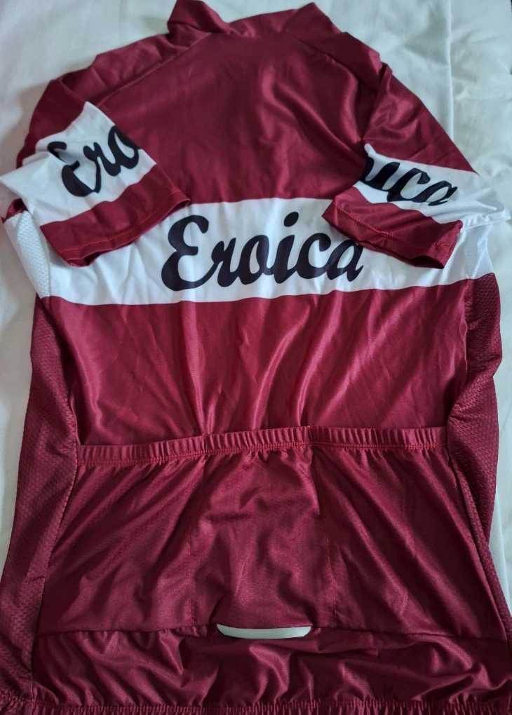 Selling a beautiful Eroica retro cycling jersey in burgundy and white! The jersey features the Eroica logo prominently across the chest and sleeves. Perfect for vintage cycling enthusiasts!