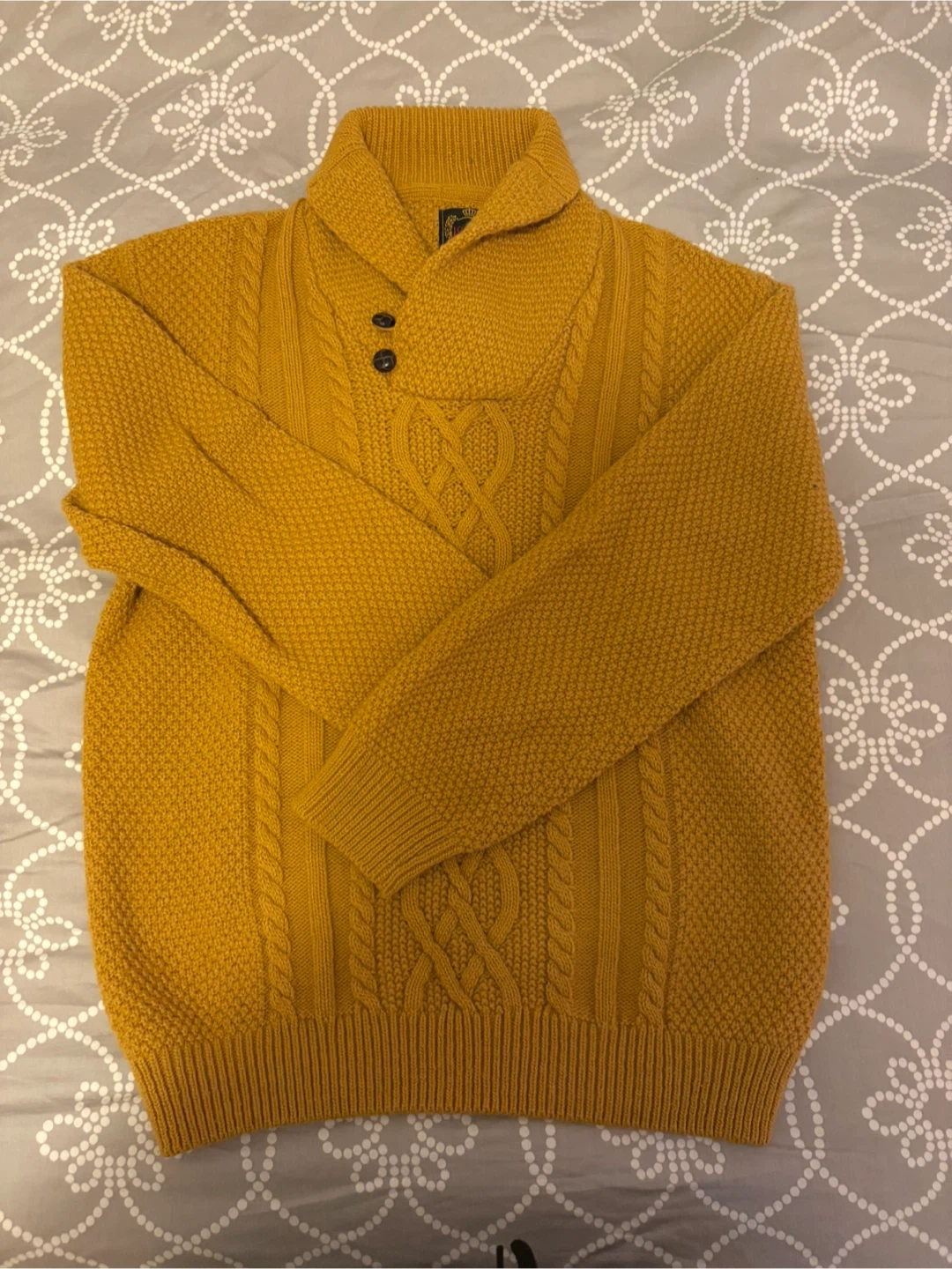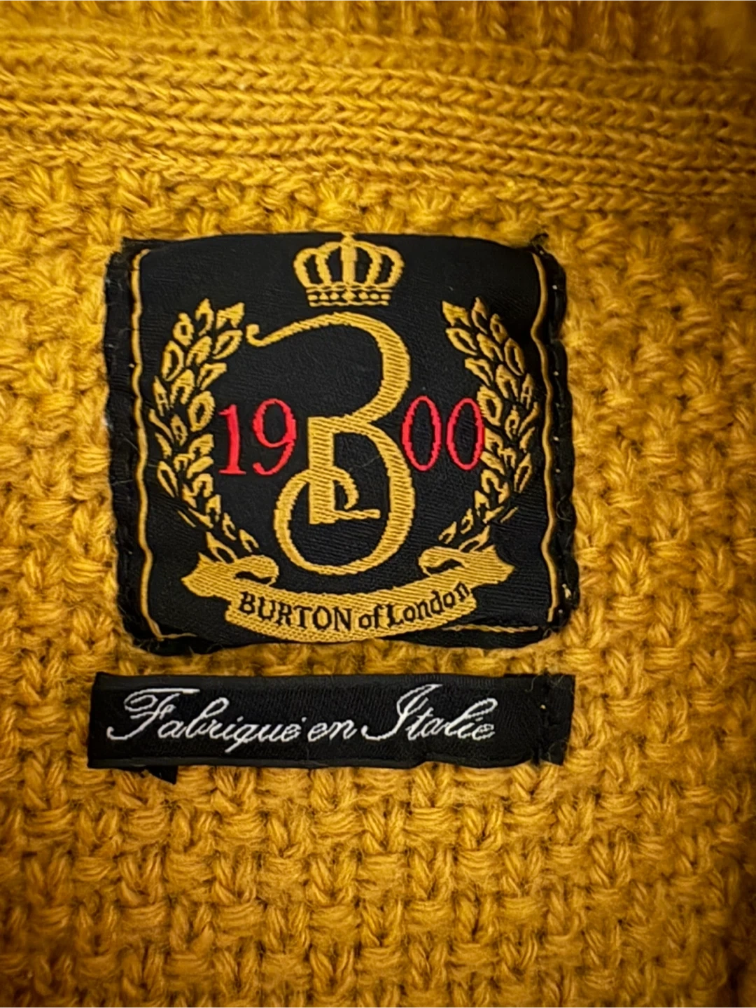 Cozy Burton of London sweater in a lovely mustard colour! It's a cable knit with a unique collar and button detail. The tag says 'Fabrique en Italie' so you know it's well made!