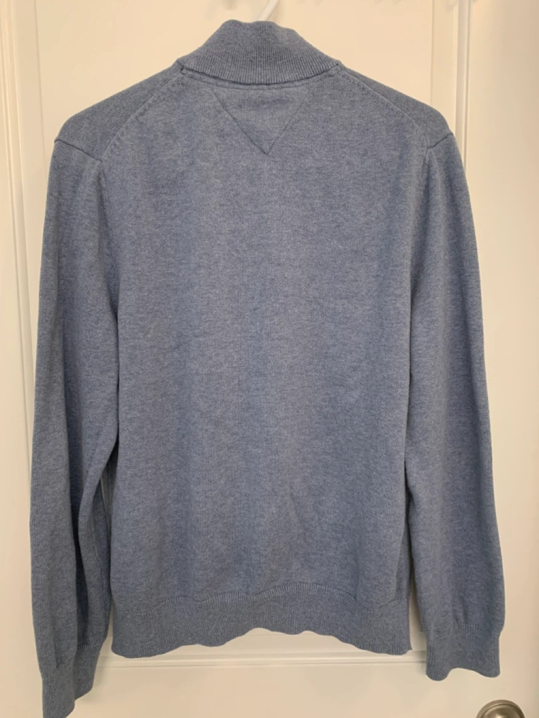Tommy Hilfiger quarter zip sweater in a light blue colour! It's a size large and in great condition. The material feels soft and comfortable, perfect for layering or wearing on its own. The chest measures approximately 21 inches across.