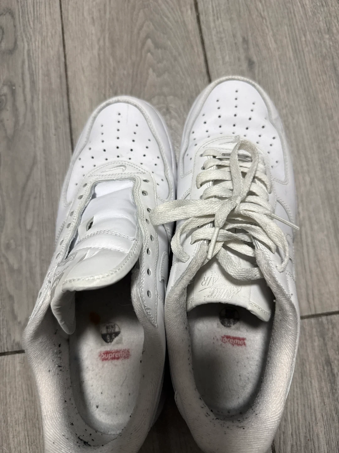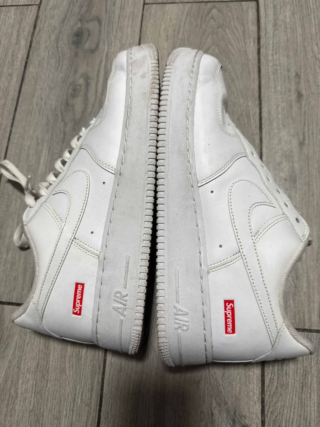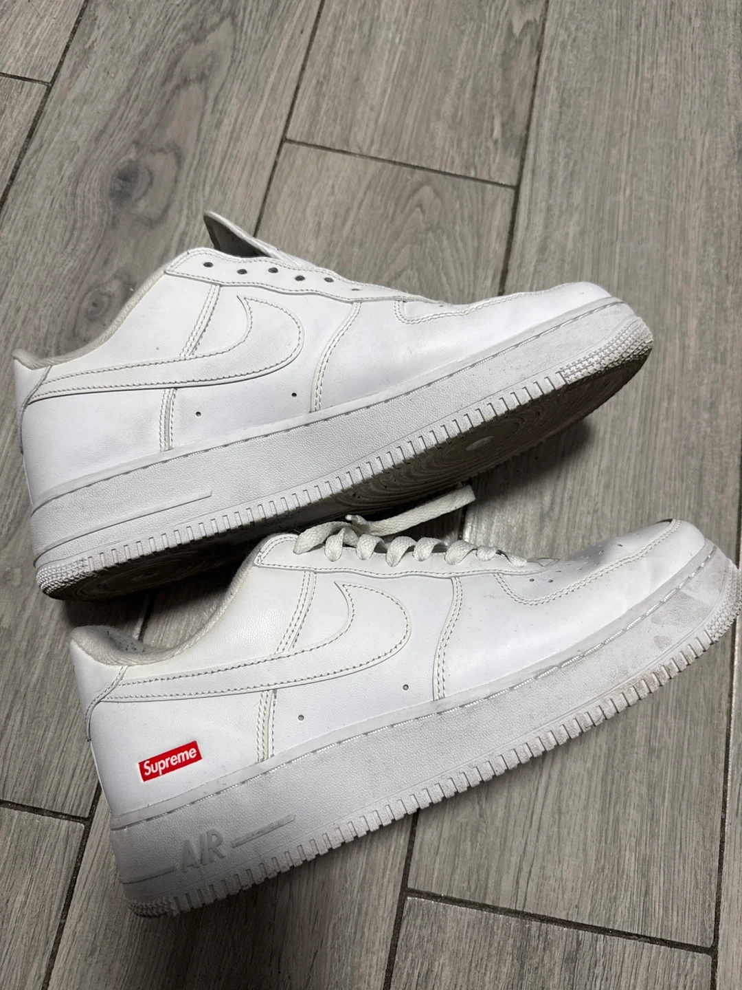 Selling a pair of Nike Air Force 1 Supreme sneakers in white. They show some signs of wear, as you can see in the photos. Still have lots of life left!