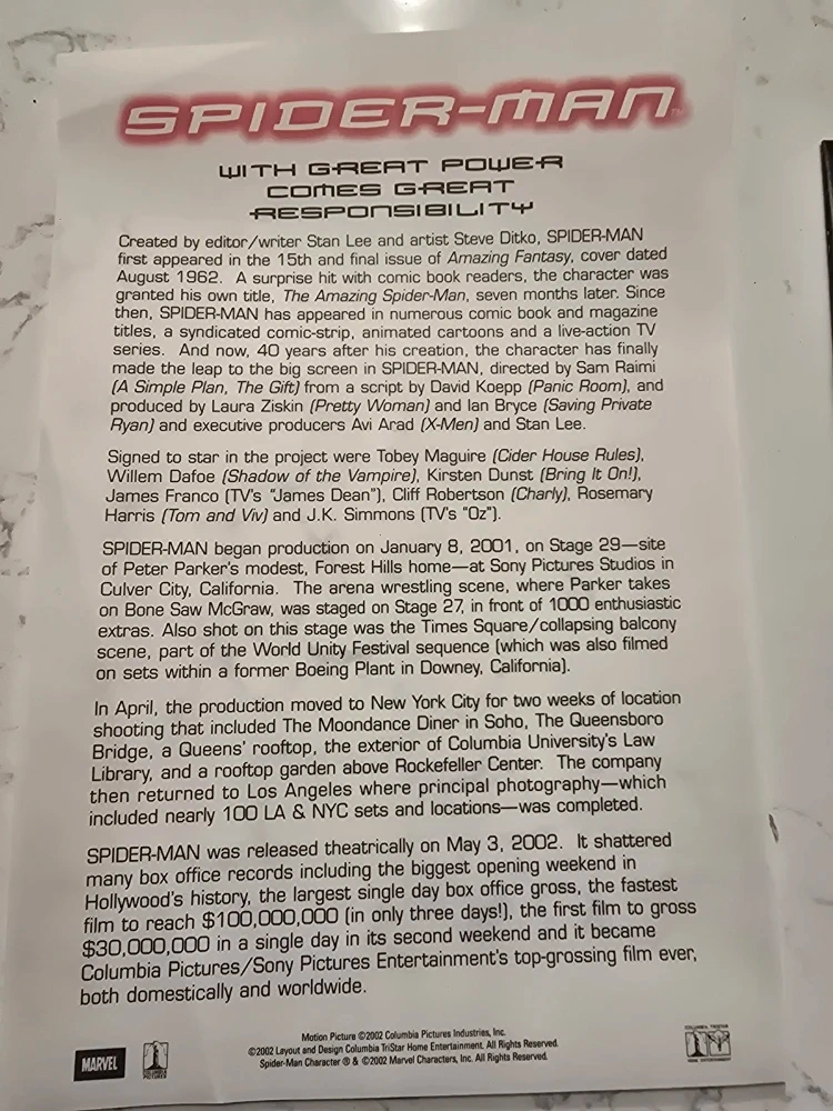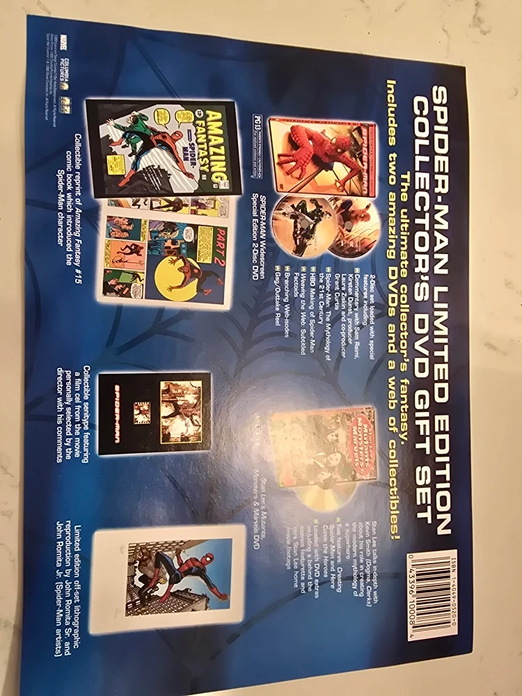 Selling a Spider-Man Limited Edition DVD Collector's Gift Set! It includes two amazing DVDs and a web of collectibles, including a collectible reprint of Amazing Fantasy #15, which introduced the comic book Spider-Man character. Also comes with a collectible reprint featuring a film cell from the movie personally selected by the director with his comments! The box is included. Missing disc 1