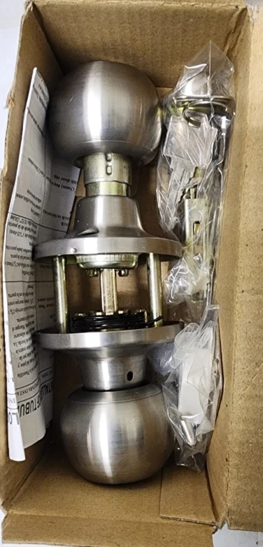 Selling a brand new door knob set! It comes in its original box with all the necessary components for installation. The finish is stainless steel, giving it a sleek and modern look. Perfect for adding a touch of style to any door!