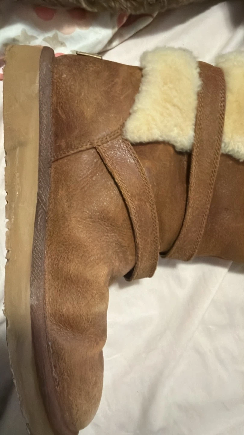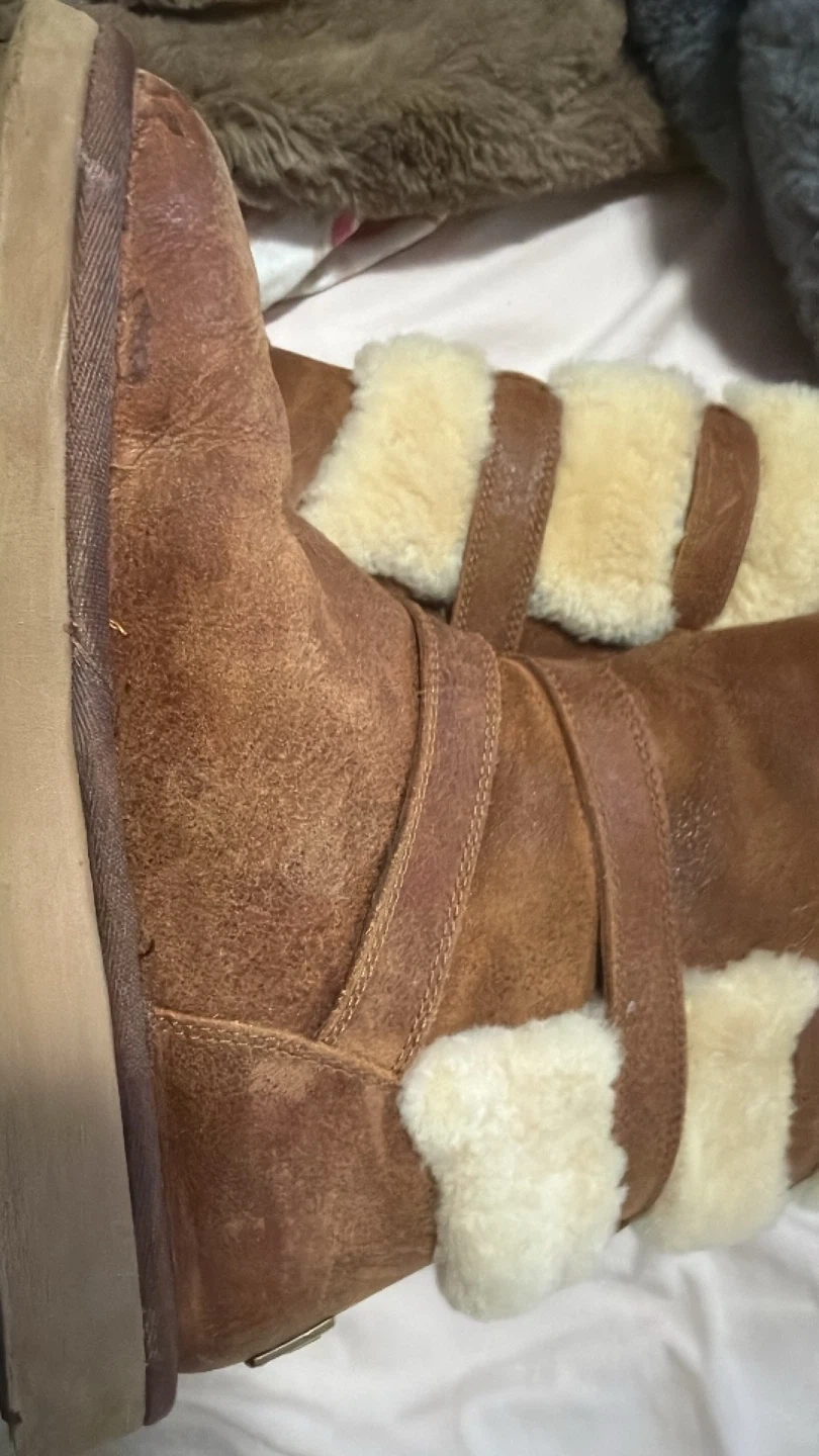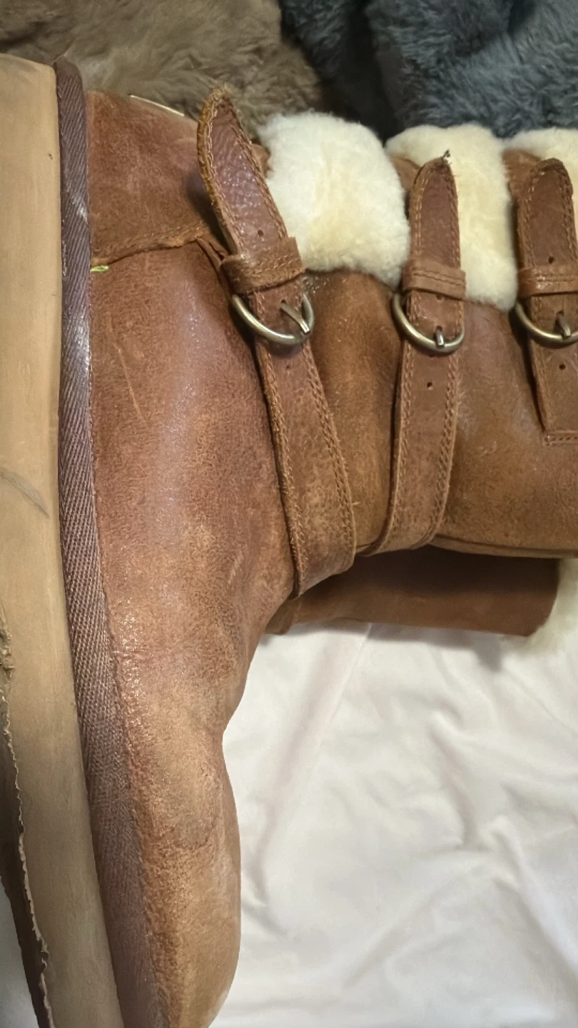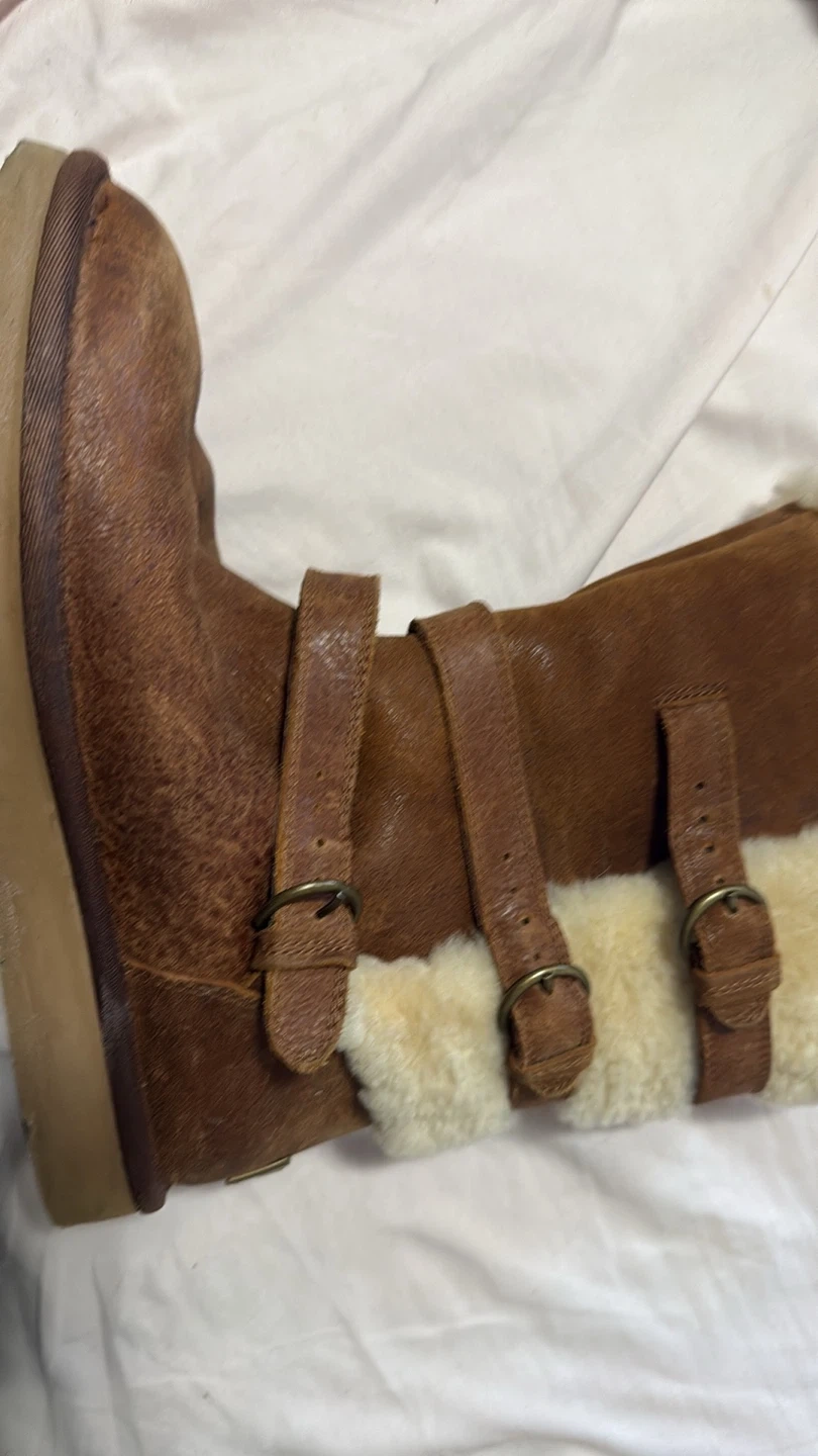 Selling a pair of UGG boots in brown leather. They feature a buckle design and are lined with cozy shearling. Perfect for keeping your feet warm and stylish!